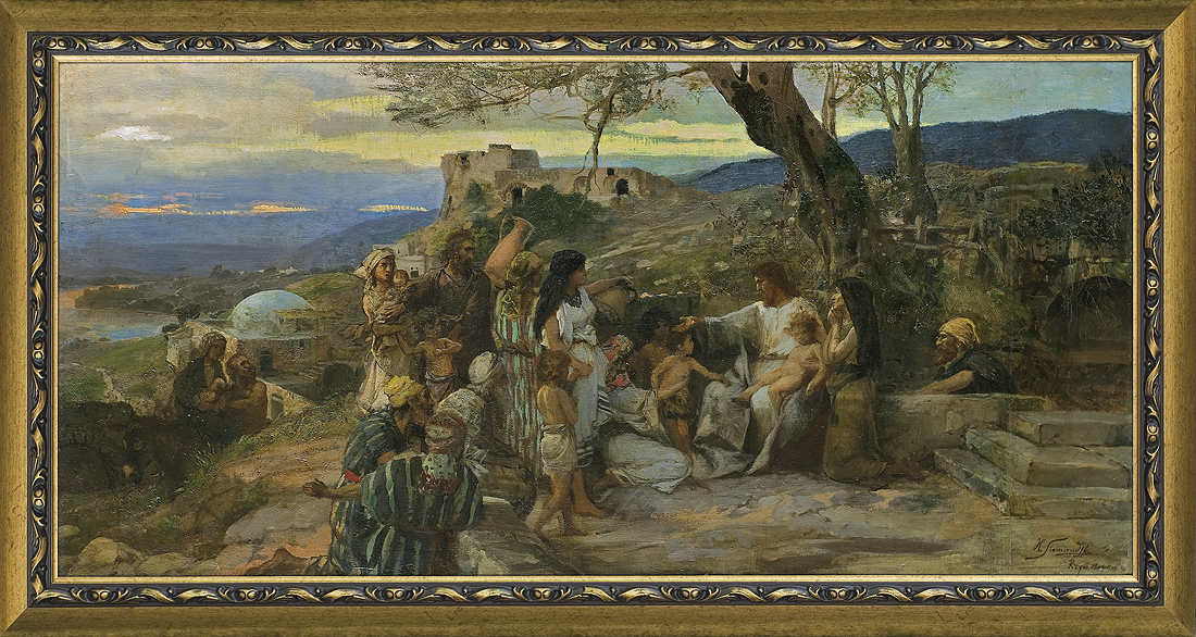 Chrystus błogosławiący dzieci był ostatnim obrazem Siemiradzkiego, obrazem, który - jak pisał S. Lewandowski, pierwszy monografista malarza - „zaledwie podmalowany” pozostał na sztalugach w jego rzymskiej pracowni, „nieskończony wprawdzie, ale posiadający znów w całej pełni największy rzut Siemiradzkiego – wspaniały krajobraz”.