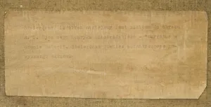 Po stronie prawej - nalepka - maszynopis podpisany przez syna malarza - o treści: Stwierdzam, iż obraz niniejszy jest szkicem do obrazu | Ś.P. Ojca mego Henryka Siemiradzkiego – „Chrystus w | Gronie Dzieci”. Stwierdzam również autentyczność po- | wyższego szkicu. | Leon Siemiradzki