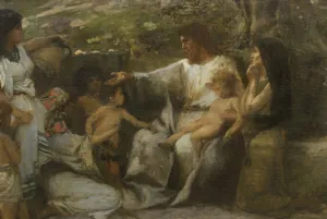 Pomysł tej kompozycji narodził się kilka lat wcześniej; w różnych wzmiankach i artykułach prasowych wiadomości o pracy artysty nad Chrystusem błogosławiącym dzieci pojawiają się już w roku 1885. Lata późniejsze przynoszą nowe informacje, zawsze jednak dość skąpe i enigmatyczne. Nieco więcej pisze dopiero A. Wysocki, który w 1899 odwiedził pracownię Siemiradzkiego w Rzymie; podaje on mianowicie informację, że artysta zamierzał wysłać Chrystusa błogosławiącego ... na wystawę do Paryża. Przytacza też słowa Siemiradzkiego; - „Chciałem przedstawić ów moment, w którym dzieci towarzyszące swym matkom idącym po wodę, garną się do Chrystusa siedzącego przy cysternie. W obrazie zmienię trochę dalsze plany i kompozycję. Rozszerzę ją ....” - dalej pisze Wysocki o „uroku i nastroju” oglądanego szkicu, o „cichym rozbłękitnionym zmierzchu i głowie Chrystusa ogromnie pięknej, ponad ludzkie miłosierdzie – miłosiernej, ponad ludzki smutek – smutnej”.