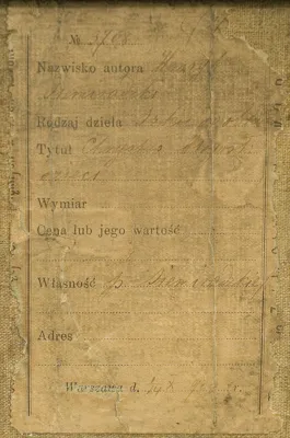 Na odwrocie - po lewej - nalepka pośmiertnej wystawy Henryka Siemiradzkiego w TZSP w Warszawie w 1902/1903 r. (druk, atrament): - No 3708 /4 |Nazwisko autora Henryk | Siemiradzki | Rodzaj dzieła Szkic do obrazu | Tytuł Chrystus błogosł. | dzieci | Wymiar | Cena lub jego wartość | Własność p. Siemiradzkiej | Adres | Warszawa d. 1/14 X 902 r.