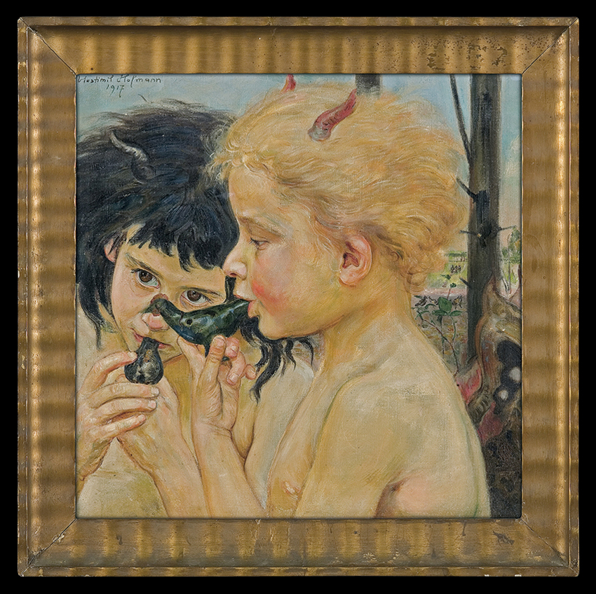 Wlastimil Hofman / Vlastimil Hofmann (Praga 1881 - Szklarska Poręba 1970) studiował w krakowskiej Szkole Sztuk Pięknych - początkowo pod kierunkiem Floriana Cynka, później także u Jana Stanisławskiego, Leona Wyczółkowskiego i Jacka Malczewskiego. W latach 1899-1902 uczył się jeszcze u Jeana Léona Gérôme’a w paryskiej École des Beaux-Arts. W czasie I wojny światowej przebywał w Pradze i w Paryżu; od 1920 stale mieszkał w Krakowie. Dużo wystawiał; należał do wielu stowarzyszeń twórczych - był współzałożycielem „Grupy Pięciu” (1905) i „Grupy Zero” (1908), członkiem Związku Artystów Czeskich „Manes”, a od 1911 członkiem Tow. Artystów Polskich „Sztuka”. W czasie II wojny światowej poprzez ZSRR i Turcję przedostał się do Jerozolimy, skąd w roku 1946 wrócił do Krakowa. Od roku 1947 stale mieszkał w Szklarskiej Porębie. Hofman malował przede wszystkim fantastyczno-symboliczne kompozycje o motywach ludowych oraz sceny rodzajowe, portrety i pejzaże. Jego obrazy mimo bliskich analogii i powiązań ze sztuką Malczewskiego odznaczają się zawsze indywidualnym charakterem, stylem i nastrojem.