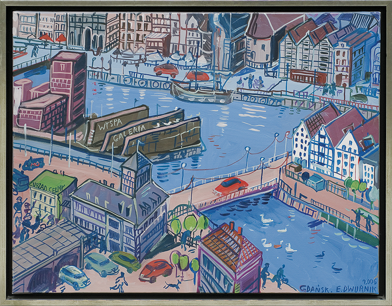 Edward Dwurnik (Radzymin 19 IV 1943 - Warszawa 28 X 2018) studiował malarstwo w ASP w Warszawie (1963-1970), jednak jako swego „mistrza“ wymienia Nikifora. Jego to prace, zobaczone po raz pierwszy w 1965, zainspirowały ówczesnego studenta III roku do narysowania pierwszych prac z cyklu „Podróże autostopem“, które kontynuował w nastepnych latach. W 1972-1978 powstawał cykl „Sportowcy“, w którym portretowane były, dodajmy - kąśliwie, typowe postaci z lat 70. Równolegle od 1975 powstawał cykl „Robotnicy“, który kulminował w okresie „Solidarności“ 1980-1981. Za prace z tego cyklu Dwurnik otrzymał w 1981 Nagrodę Krytyki Artystycznej im. Cypriana Kamila Norwida, natomiast za obrazy z cyklu „Warszawa“ (1981), proroczo zapowiadające stan wojenny - Nagrodę Kulturalną „Solidarności“ podziemnej w 1983. W latach 80. malarstwo Dwurnika przybrało wyraz ekspresyjny i dramatyczny. Powstające w tej dekadzie obrazy miały niejednokrotnie wymowę polityczną, przybierały też kostium historyczny, tak czy inaczej odnoszący się do współczesnych spraw i realiów. Cykl „Droga na Wschód“ (1989-91) upamiętniał ofiary stalinizmu, natomiast cykl „Od Grudnia do Czerwca“ (1990-94) - ofiary stanu wojennego. Zarówno ideowe, jak i czysto malarskie walory tych prac przyniosły artyście ogromne uznanie, zarówno w kraju jak i za granicą. Jego wyrazem była prestiżowa nagroda Fundacji Coutts & Co w Zurychu (1992). W latach 90. powstają cykle będące kontynuacją „Podróży autostopem“: „Niebieskie miasta“ (od 1993) i „Diagonale“ (od 1996), jak również kompozycje nowego typu, jak widoki morskie (cykl „Błękitne“, 1992-93) czy cykl „Wyliczanka“ (1996-99). Artysta wiele wystawia, miał ok. 100 wystaw indywidualnych w Polsce i za granicą, brał też udział w licznych wystawach i festiwalach krajowych i międzynarodowych, m.in.: X Biennale Sztuki Współczesnej, Menton 1974, Documenta 7, Kassel 1982, 5th Biennale, Sydney 1985, XIX Biennale Sztuki, Sao Paulo 1987; Olimpiada Sztuki, Seul 1988. Równolegle z malarstwem uprawiał rysunek, collage, grafikę warsztatową (litografia, techniki metalowe, kserografia, stemple) i użytkową (ilustracja, plakaty do własnych wystaw indywidualnych).