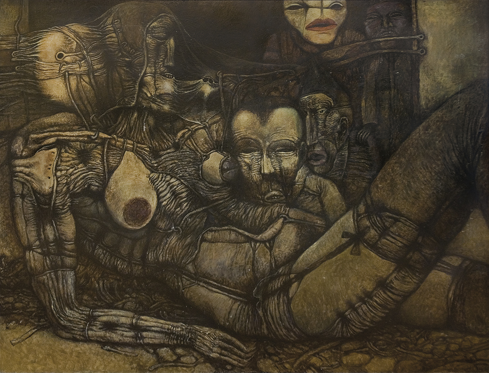 Zdzisław Beksiński (Sanok 24 II 1929 - Warszawa 21 II 2005) studiował w latach 1947-1952 na Wydziale Architektury Politechniki Krakowskiej. Był artystą samoukiem, który osiągnął niekwestionowaną pozycję w polskiej sztuce współczesnej, potwierdzoną obecnością jego prac na prestiżowych wystawach i w kolekcjach muzealnych. Początkowo zajmował się fotografią, którą interesował się od lat studenckich, po 1956 zyskując uznanie jako twórca fotogramów o estetyce opartej o efekty fakturowe. W latach 1958-1962 tworzył abstrakcyjne obrazy-reliefy o bogatej fakturze, głównie metalowe, będące odmianą malarstwa materii. Pod koniec tego okresu powstawały ażurowe formy o kształtach figur i pełnoplastyczne rzeźby w metalu. Kolejnym etapem jego twórczości były lata 1962-1974, kiedy poświęcał się głównie rysunkowi. W latach 60. rysował piórkiem i tuszem figuralne kompozycje odznaczające się karykaturalną deformacją postaci. Od końca lat 60. tworzył rysunki węglem i kredkami, będące monochromatyczną odmianą jego równoległej twórczości malarskiej. Od 1974 zajmował się niemal niepodzielnie malarstwem. Jego charakterystyczny styl bazował na perfekcji technicznej, której towarzyszyła niezwykłość wizji. Malował świat po katastrofie, naznaczony piętnem śmierci i rozpadu. Jego obrazy zaludniają postaci i stwory o ludzkich wprawdzie bądź zwierzęcych kształtach, lecz o cechach fantomów, automatów lub rozpadających się trucheł. Artysta nie nadawał swym obrazom i rysunkom tytułów (poza porządkującymi symbolami), akcentując w ten sposób swój brak zainteresowania dla literackiej strony przedstawień. Sam mówił, że malując całkowicie poddaje się wizji, „fotografuje“ ją. W ostatnich latach włączył do swego warsztatu artystycznego elektroniczne techniki generowania obrazu, które wykorzystywał do tworzenia komputerowych fotomontaży. Sztuka Beksińskiego, wielokrotnie wystawiana i omawiana, budzi skrajne emocje wśród znawców i publiczności.