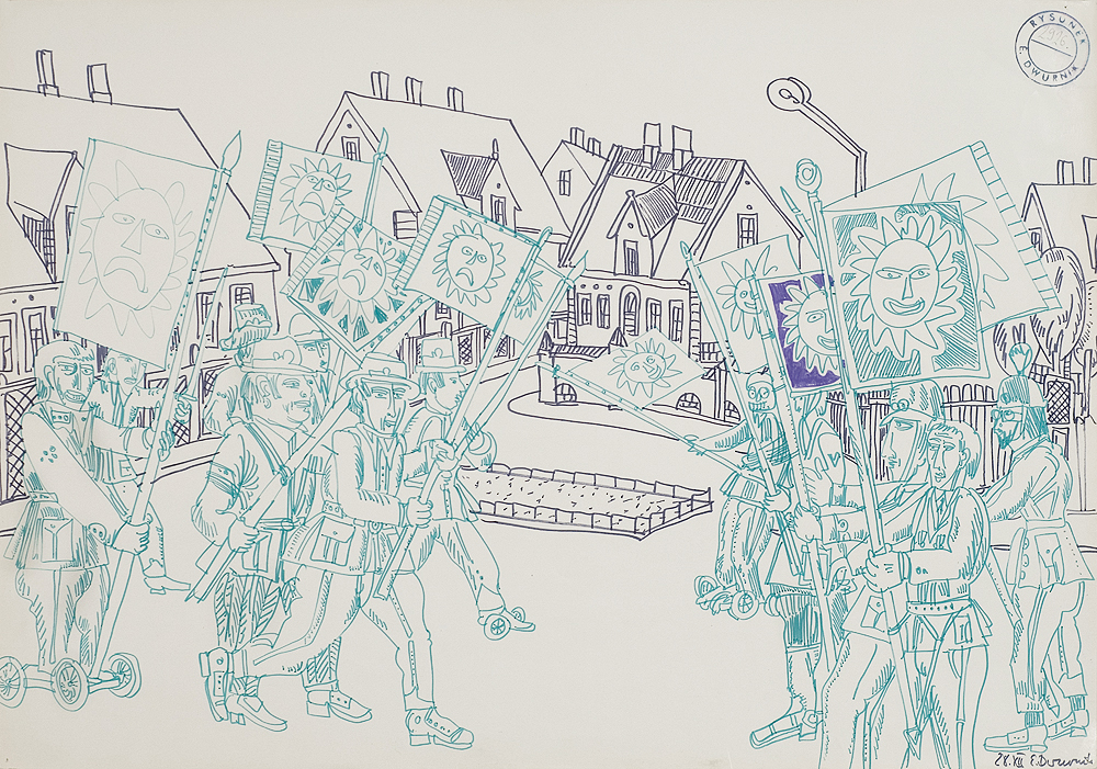Edward Dwurnik (Radzymin 19 IV 1943 - Warszawa 28 X 2018) studiował malarstwo w ASP w Warszawie (1963-1970), jednak jako swego „mistrza“ wymienia Nikifora. Jego to prace, zobaczone po raz pierwszy w 1965, zainspirowały ówczesnego studenta III roku do narysowania pierwszych prac z cyklu „Podróże autostopem“, które kontynuował w nastepnych latach. W 1972-1978 powstawał cykl „Sportowcy“, w którym portretowane były, dodajmy - kąśliwie, typowe postaci z lat 70. Równolegle od 1975 powstawał cykl „Robotnicy“, który kulminował w okresie „Solidarności“ 1980-1981. Za prace z tego cyklu Dwurnik otrzymał w 1981 Nagrodę Krytyki Artystycznej im. Cypriana Kamila Norwida, natomiast za obrazy z cyklu „Warszawa“ (1981), proroczo zapowiadające stan wojenny - Nagrodę Kulturalną „Solidarności“ podziemnej w 1983. W latach 80. malarstwo Dwurnika przybrało wyraz ekspresyjny i dramatyczny. Powstające w tej dekadzie obrazy miały niejednokrotnie wymowę polityczną, przybierały też kostium historyczny, tak czy inaczej odnoszący się do współczesnych spraw i realiów. Cykl „Droga na Wschód“ (1989-91) upamiętniał ofiary stalinizmu, natomiast cykl „Od Grudnia do Czerwca“ (1990-94) - ofiary stanu wojennego. Zarówno ideowe, jak i czysto malarskie walory tych prac przyniosły artyście ogromne uznanie, zarówno w kraju jak i za granicą. Jego wyrazem była prestiżowa nagroda Fundacji Coutts & Co w Zurychu (1992). W latach 90. powstają cykle będące kontynuacją „Podróży autostopem“: „Niebieskie miasta“ (od 1993) i „Diagonale“ (od 1996), jak również kompozycje nowego typu, jak widoki morskie (cykl „Błękitne“, 1992-93) czy cykl „Wyliczanka“ (1996-99). Artysta wiele wystawia, miał ok. 100 wystaw indywidualnych w Polsce i za granicą, brał też udział w licznych wystawach i festiwalach krajowych i międzynarodowych, m.in.: X Biennale Sztuki Współczesnej, Menton 1974, Documenta 7, Kassel 1982, 5th Biennale, Sydney 1985, XIX Biennale Sztuki, Sao Paulo 1987; Olimpiada Sztuki, Seul 1988. Równolegle z malarstwem uprawiał rysunek, collage, grafikę warsztatową (litografia, techniki metalowe, kserografia, stemple) i użytkową (ilustracja, plakaty do własnych wystaw indywidualnych).