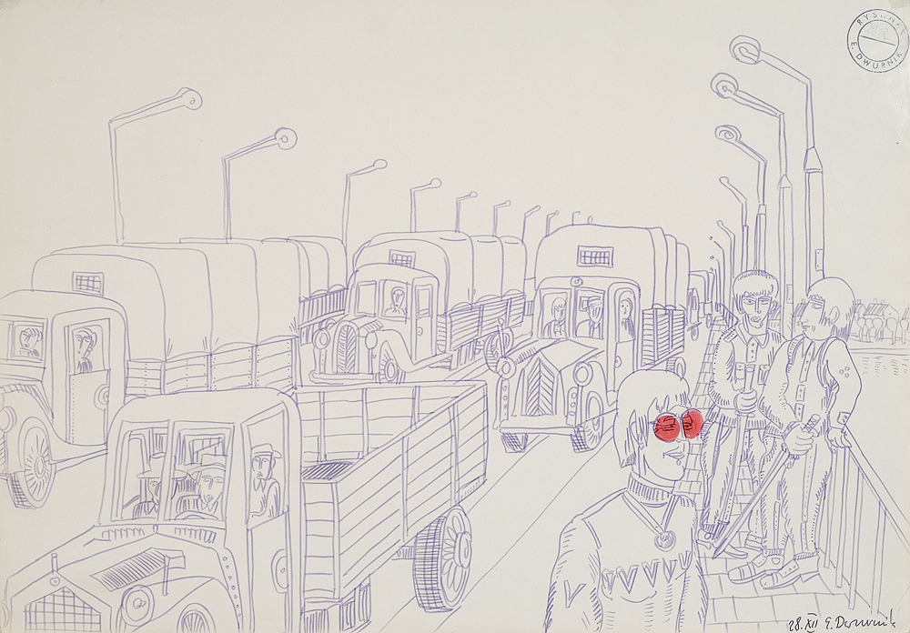 Edward Dwurnik (Radzymin 19 IV 1943 - Warszawa 28 X 2018) studiował malarstwo w ASP w Warszawie (1963-1970), jednak jako swego „mistrza“ wymienia Nikifora. Jego to prace, zobaczone po raz pierwszy w 1965, zainspirowały ówczesnego studenta III roku do narysowania pierwszych prac z cyklu „Podróże autostopem“, które kontynuował w nastepnych latach. W 1972-1978 powstawał cykl „Sportowcy“, w którym portretowane były, dodajmy - kąśliwie, typowe postaci z lat 70. Równolegle od 1975 powstawał cykl „Robotnicy“, który kulminował w okresie „Solidarności“ 1980-1981. Za prace z tego cyklu Dwurnik otrzymał w 1981 Nagrodę Krytyki Artystycznej im. Cypriana Kamila Norwida, natomiast za obrazy z cyklu „Warszawa“ (1981), proroczo zapowiadające stan wojenny - Nagrodę Kulturalną „Solidarności“ podziemnej w 1983. W latach 80. malarstwo Dwurnika przybrało wyraz ekspresyjny i dramatyczny. Powstające w tej dekadzie obrazy miały niejednokrotnie wymowę polityczną, przybierały też kostium historyczny, tak czy inaczej odnoszący się do współczesnych spraw i realiów. Cykl „Droga na Wschód“ (1989-91) upamiętniał ofiary stalinizmu, natomiast cykl „Od Grudnia do Czerwca“ (1990-94) - ofiary stanu wojennego. Zarówno ideowe, jak i czysto malarskie walory tych prac przyniosły artyście ogromne uznanie, zarówno w kraju jak i za granicą. Jego wyrazem była prestiżowa nagroda Fundacji Coutts & Co w Zurychu (1992). W latach 90. powstają cykle będące kontynuacją „Podróży autostopem“: „Niebieskie miasta“ (od 1993) i „Diagonale“ (od 1996), jak również kompozycje nowego typu, jak widoki morskie (cykl „Błękitne“, 1992-93) czy cykl „Wyliczanka“ (1996-99). Artysta wiele wystawia, miał ok. 100 wystaw indywidualnych w Polsce i za granicą, brał też udział w licznych wystawach i festiwalach krajowych i międzynarodowych, m.in.: X Biennale Sztuki Współczesnej, Menton 1974, Documenta 7, Kassel 1982, 5th Biennale, Sydney 1985, XIX Biennale Sztuki, Sao Paulo 1987; Olimpiada Sztuki, Seul 1988. Równolegle z malarstwem uprawiał rysunek, collage, grafikę warsztatową (litografia, techniki metalowe, kserografia, stemple) i użytkową (ilustracja, plakaty do własnych wystaw indywidualnych).