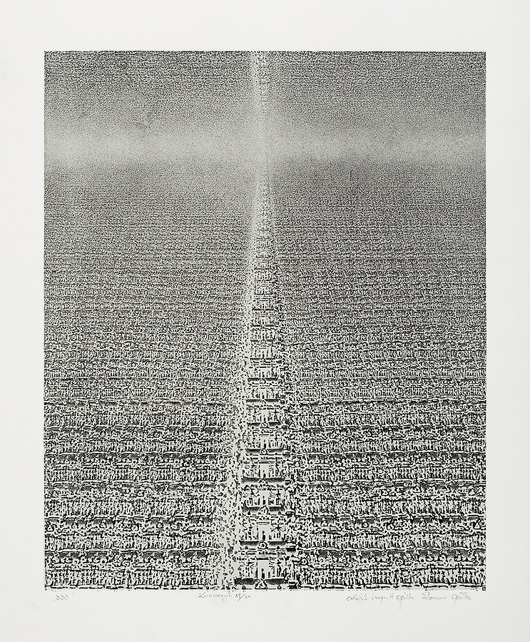 Roman Opałka (Abbéville, Francja 1931 - Rzym 2011) po przyjeździe wraz z rodziną do Polski uczył się w szkole poligraficznej w Nowej Rudzie, po czym podjął studia w Państwowej Wyższej Szkole Sztuk Plastycznych w Łodzi (1949-1950). Kontynuował je w ASP w Warszawie (1950-1956). We wczesnym okresie tworzył cykle malarskie i rysunkowe („Chronomy“, 1961-1963, „Fonematy“, 1963-1964, „Alfabet grecki“, 1965), obiekty przestrzenne („Poduszkowce“, „Integracje“, 1964-1966) oraz cykle graficzne i ilustracje. Od 1965 realizuje program „Obrazów liczonych 1-oo “, który jest projektem na całe życie, polegającym na zapełnianiu powierzchni obrazów kolejnymi liczbami. Już w trakcie realizacji tego programu, w 1965-67 i 1968-70 wykonał dwa cykle graficzne: poświęcony Rewolucji Październikowej (litografie barwne) i „Opisanie świata“ (kwasoryty), za który zdobył liczne nagrody na wystawach międzynarodowych. Od 1970 kontynuuje wyłącznie „Obrazy liczone“ w malarstwie („Detale“), rysunku („Kartki z podróży“) oraz rejestracjach fotograficznych, video i dźwiękowych. Od polowy lat 70. mieszka we Francji. Reprezentował Polskę na Biennale w Wenecji w 1995.