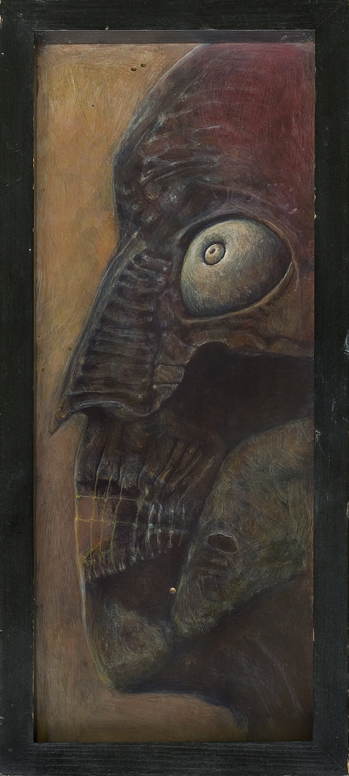 Zdzisław Beksiński (Sanok 24 II 1929 - Warszawa 21 II 2005) studiował w latach 1947-1952 na Wydziale Architektury Politechniki Krakowskiej. Był artystą samoukiem, który osiągnął niekwestionowaną pozycję w polskiej sztuce współczesnej, potwierdzoną obecnością jego prac na prestiżowych wystawach i w kolekcjach muzealnych. Początkowo zajmował się fotografią, którą interesował się od lat studenckich, po 1956 zyskując uznanie jako twórca fotogramów o estetyce opartej o efekty fakturowe. W latach 1958-1962 tworzył abstrakcyjne obrazy-reliefy o bogatej fakturze, głównie metalowe, będące odmianą malarstwa materii. Pod koniec tego okresu powstawały ażurowe formy o kształtach figur i pełnoplastyczne rzeźby w metalu. Kolejnym etapem jego twórczości były lata 1962-1974, kiedy poświęcał się głównie rysunkowi. W latach 60. rysował piórkiem i tuszem figuralne kompozycje odznaczające się karykaturalną deformacją postaci. Od końca lat 60. tworzył rysunki węglem i kredkami, będące monochromatyczną odmianą jego równoległej twórczości malarskiej. Od 1974 zajmował się niemal niepodzielnie malarstwem. Jego charakterystyczny styl bazował na perfekcji technicznej, której towarzyszyła niezwykłość wizji. Malował świat po katastrofie, naznaczony piętnem śmierci i rozpadu. Jego obrazy zaludniają postaci i stwory o ludzkich wprawdzie bądź zwierzęcych kształtach, lecz o cechach fantomów, automatów lub rozpadających się trucheł. Artysta nie nadawał swym obrazom i rysunkom tytułów (poza porządkującymi symbolami), akcentując w ten sposób swój brak zainteresowania dla literackiej strony przedstawień. Sam mówił, że malując całkowicie poddaje się wizji, „fotografuje“ ją. W ostatnich latach włączył do swego warsztatu artystycznego elektroniczne techniki generowania obrazu, które wykorzystywał do tworzenia komputerowych fotomontaży. Sztuka Beksińskiego, wielokrotnie wystawiana i omawiana, budzi skrajne emocje wśród znawców i publiczności.