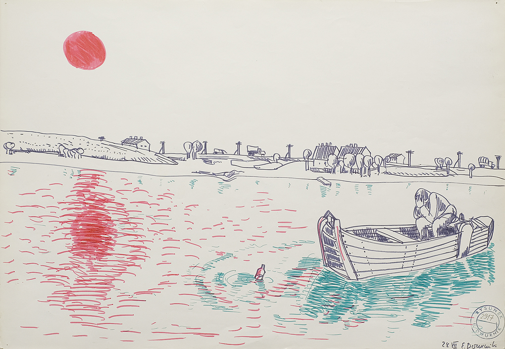 Edward Dwurnik (Radzymin 19 IV 1943 - Warszawa 28 X 2018) studiował malarstwo w ASP w Warszawie (1963-1970), jednak jako swego „mistrza“ wymienia Nikifora. Jego to prace, zobaczone po raz pierwszy w 1965, zainspirowały ówczesnego studenta III roku do narysowania pierwszych prac z cyklu „Podróże autostopem“, które kontynuował w nastepnych latach. W 1972-1978 powstawał cykl „Sportowcy“, w którym portretowane były, dodajmy - kąśliwie, typowe postaci z lat 70. Równolegle od 1975 powstawał cykl „Robotnicy“, który kulminował w okresie „Solidarności“ 1980-1981. Za prace z tego cyklu Dwurnik otrzymał w 1981 Nagrodę Krytyki Artystycznej im. Cypriana Kamila Norwida, natomiast za obrazy z cyklu „Warszawa“ (1981), proroczo zapowiadające stan wojenny - Nagrodę Kulturalną „Solidarności“ podziemnej w 1983. W latach 80. malarstwo Dwurnika przybrało wyraz ekspresyjny i dramatyczny. Powstające w tej dekadzie obrazy miały niejednokrotnie wymowę polityczną, przybierały też kostium historyczny, tak czy inaczej odnoszący się do współczesnych spraw i realiów. Cykl „Droga na Wschód“ (1989-91) upamiętniał ofiary stalinizmu, natomiast cykl „Od Grudnia do Czerwca“ (1990-94) - ofiary stanu wojennego. Zarówno ideowe, jak i czysto malarskie walory tych prac przyniosły artyście ogromne uznanie, zarówno w kraju jak i za granicą. Jego wyrazem była prestiżowa nagroda Fundacji Coutts & Co w Zurychu (1992). W latach 90. powstają cykle będące kontynuacją „Podróży autostopem“: „Niebieskie miasta“ (od 1993) i „Diagonale“ (od 1996), jak również kompozycje nowego typu, jak widoki morskie (cykl „Błękitne“, 1992-93) czy cykl „Wyliczanka“ (1996-99). Artysta wiele wystawia, miał ok. 100 wystaw indywidualnych w Polsce i za granicą, brał też udział w licznych wystawach i festiwalach krajowych i międzynarodowych, m.in.: X Biennale Sztuki Współczesnej, Menton 1974, Documenta 7, Kassel 1982, 5th Biennale, Sydney 1985, XIX Biennale Sztuki, Sao Paulo 1987; Olimpiada Sztuki, Seul 1988. Równolegle z malarstwem uprawiał rysunek, collage, grafikę warsztatową (litografia, techniki metalowe, kserografia, stemple) i użytkową (ilustracja, plakaty do własnych wystaw indywidualnych).