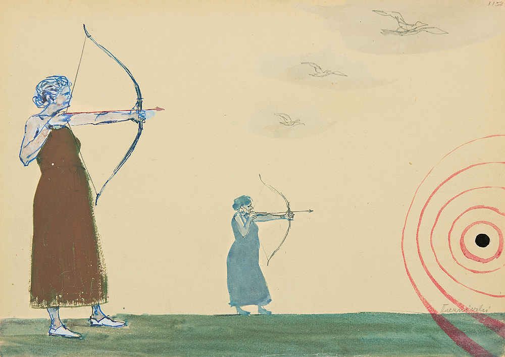 gwasz, akwarela, atrament pióro, papier
