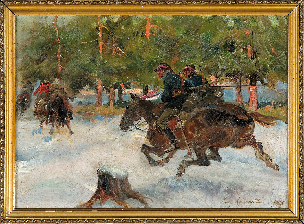 Jerzy Kossak (Kraków 1886 - Kraków 1955)- syn Wojciecha, wnuk Juliusza Kossaków - od wczesnego dzieciństwa malował pod kierunkiem ojca i dziadka. Kontynuator i naśladowca ich sztuki tworzył sceny batalistyczne, historyczne i rodzajowe z wszechobecnym motywem konia. Malował obrazy z powstania listopadowego, wojen napoleońskich oraz wiele scen z wojny 1920 roku. Najbardziej znaną jego kompozycją tego rodzaju był Cud nad Wisłą. Malował też liczne Pogonie i Pościgi ułanów za kozakami, Napady wilków, Polowania i Wesela. Tematyka tych prac sprawia, że stale cieszą się zainteresowaniem zbieraczy i publiczności, zawsze tłumnie odwiedzającej wystawy malarstwa Kossaków.