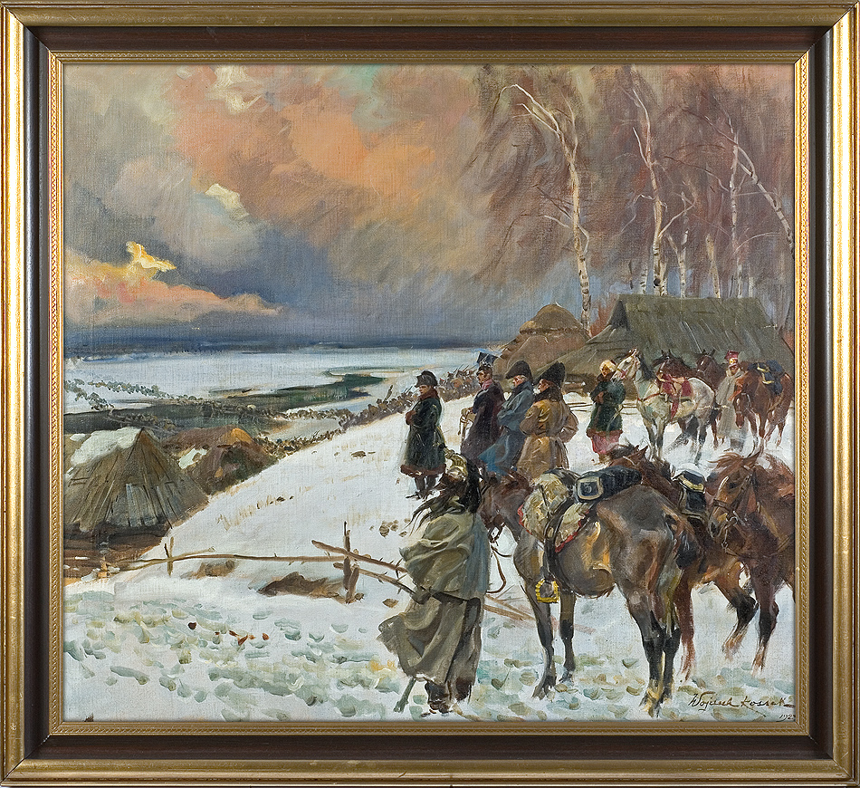Wojciech Kossak (Paryż 1856 - Kraków 1942 ) – powszechnie znany malarz, postrzegany przede wszystkim jako świetny batalista. Syn i uczeń Juliusza Kossaka kształcił się w krakowskiej Szkole Sztuk Pięknych, w Akademii monachijskiej oraz w Paryżu. W latach 1895-1902 przebywał głównie w Berlinie, pracując dla cesarza Wilhelma II. Wiele podróżował, m.in. do Hiszpanii i Egiptu, gdzie wykonywał szkice do zamierzonych panoram. W późniejszych latach kilkakrotnie wyjeżdżał do Stanów Zjednoczonych wykonując zamówienia portretowe. W 1913 był mianowany profesorem warszawskiej Szkoły Sztuk Pięknych. W latach I wojny światowej pełnił służbę wojskową. Był współautorem panoram: „Racławice” (1893-1894), „Berezyna” (1895-1896), „Bitwa pod piramidami” (1901) oraz szkiców do niezrealizowanej „Somosierry” (1900). Z temperamentem i swobodą tworzył szeroko malowane, dynamiczne sceny batalistyczne, historyczne, rodzajowe oraz liczne portrety. Z upodobaniem malował konie. Jego obrazy, gloryfikujące dawne i współczesne artyście polskie wojsko i bohaterstwo żołnierzy, trafiały do patriotycznych uczuć odbiorców i cieszyły się ogromna popularnością.