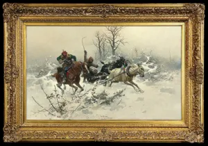 Józef Brandt (Szczebrzeszyn 1841 - Radom 1915) był jednym z najwybitniejszym polskich malarzy batalistów. Naukę malarstwa rozpoczął w Warszawie pod okiem Juliusza Kossaka. W latach 1858-1860 był w Paryżu, gdzie podjął studia inżynierskie. Niebawem zarzucił je jednak na rzecz malarstwa i kształcił się w pracowni Leona Cognieta. Po powrocie do kraju, w 1861 debiutował na wystawie w warszawskim TZSP. Od 1863 kontynuował studia w monachijskiej ASP u Franza Adama. W 1870 otworzył w Monachium własną pracownie i niebawem stał się przywódcą, „generałem” tamtejszej polskiej kolonii artystycznej i nauczycielem wielu malarzy. Po 1877 miesiące letnie spędzał w Orońsku, zapraszając na plenery grono swych uczniów. Został honorowym profesorem Akademii w Monachium (1878), członkiem Akademii w Berlinie (1877) i Pradze (1900). Odznaczony wysokimi orderami, wyróżniany medalami i nagrodami na międzynarodowych wystawach, cieszył się prawdziwie europejską sławą. Mieszkając i tworząc poza krajem zawsze wyraźnie podkreślał swoją polskość; dając jej wyraz choćby poprzez podpisywanie obrazów Józef Brandt z Warszawy. Malował bitwy, potyczki, podjazdy – epizody z historii polskich wojen kresowych i wojen szwedzkich XVII wieku, a także sceny rodzajowe – jeźdźców, polowania, jarmarki. Jego barwne, pełne ruchu i perfekcyjne warsztatowo obrazy podziwiano powszechnie, jako najlepszy przykład wysoko wówczas cenionej „szkoły polskiej”. Ale podczas gdy niemiecki czy francuski widz dostrzegał w nich przede wszystkim egzotykę i barwy Orientu, dla Polaków były to płótna „prawdziwe, naturalne, swojskie jak fragmenty z pamiętników Paska albo Rzewuskiego, przetransponowane na barwy i linie”. |