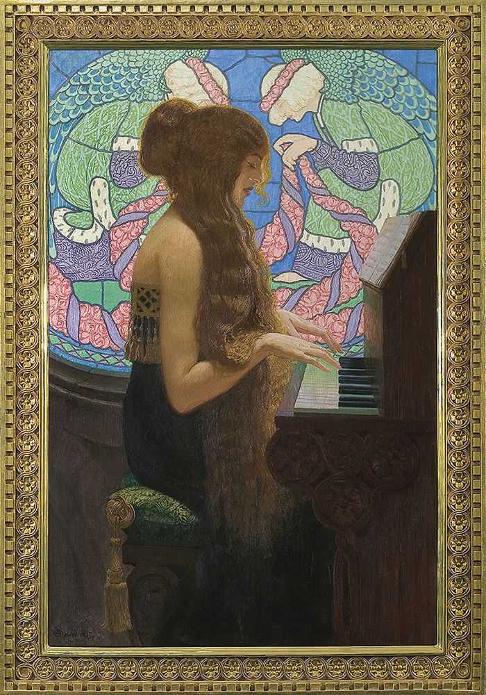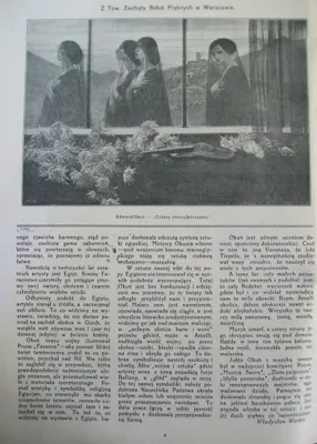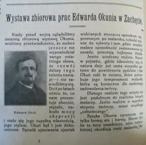 Edward Okuń (Wólka Zerzyńska /obecnie Zerzeńska/ k. Warszawy 1872 - Skierniewice 1945) – malarz, rysownik, ilustrator – studia artystyczne rozpoczął w warszawskiej Klasie Rysunkowej u Wojciecha Gersona. W latach 1891-1893 kształcił się w krakowskiej Szkole Sztuk Pięknych, m.in. u Jana Matejki, od 1893 w Monachium u Antona Ažbe, Stanisława Grocholskiego i Szymona Hollosy’ego. Studia uzupełniał w Paryżu. Od roku 1898 stale mieszkał we Włoszech – w Rzymie, a okresowo także w pobliskim Anticoli Corrado, we Florencji, Sorrento, Amalfi i na Capri. W 1914 podróżował do Egiptu. W roku 1921 wrócił do Warszawy, gdzie w latach 1925-1930 był profesorem Szkoły Sztuk Pięknych. Jeszcze kilkakrotnie wyjeżdżał do Włoch (m.in. w 1928, 1937, 1938), a w latach 1927 oraz 1929-1932 jeździł do Jugosławii, gdzie powstał cykl pejzaży Znad Adriatyku - "Jadran". Malował dekoracyjne, stylizowane portrety, idylliczne pejzaże i kompozycje o wątkach fantastycznych i baśniowych, bliskie symbolizmowi i secesji. Często sam projektował ramy do swoich obrazów, traktując je jako integralną część tych dzieł. Był wybitnym twórcą grafiki książkowej; wykonywał ilustracje, winiety, projekty okładek, inicjały i przerywniki, współpracując m.in. z warszawskim pismem „Chimera”.