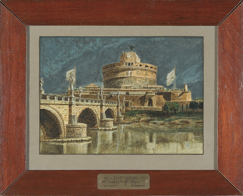 Marcin Zaleski (Kraków 1796 - Warszawa 1877) był wybitnym polskim malarzem widoków miejskich, architektury i wnętrz. Mistrzowską umiejętność malowania widoków perspektywicznych zyskał pracując w latach 1817-1822 w dekoratorni Teatru Narodowego w Warszawie, a także dzięki kopiowaniu obrazów w galerii J. Ossolińskiego i dzieł Bernarda Bellotta na Zamku Królewskim w Warszawie. W roku 1928 otrzymał złoty medal za obrazy pokazane na Warszawskiej Wystawie Sztuk Pięknych, a w 1829 stypendium rządowe, które umożliwiło mu wyjazd za granicę. Przez Niemcy pojechał najpierw do Paryża, gdzie uczył się u Pierre-Luc-Charlesa Cicéri’ego, dekoratora Opery Paryskiej, a później do Włoch. W 1830 wrócił do Warszawy. W 1846 został profesorem perspektywy w warszawskiej Szkole sztuk Pięknych. Po zamknięciu Szkoły był w latach 1865-1868 profesorem w Warszawskiej Klasie Rysunkowej. Malował, m.in. widoki Warszawy, Krakowa, Wilna, Zamościa. Malował także wnętrza – pałaców, dworów (Pałac w Łazienkach) oraz licznych kościołów w Polsce czy we Włoszech (Katedra w Mediolanie). Był również malarskim kronikarzem historii współczesnej: namalował cykl obrazów przedstawiających wypadki powstania listopadowego (Zdobycie Arsenału czy Powrót oddziałów polskich z Wierzbna). Na zamówienie rządowe stworzył też szereg widoków twierdz i miast ufortyfikowanych (Modlin, Dębno, Zamość, Bobrujsk, Brześć Litewski). W swoim malarstwie dużą rolą przykładał do roli światła, wydobywającego i modelującego kształty i grającego w miejskim pejzażu.