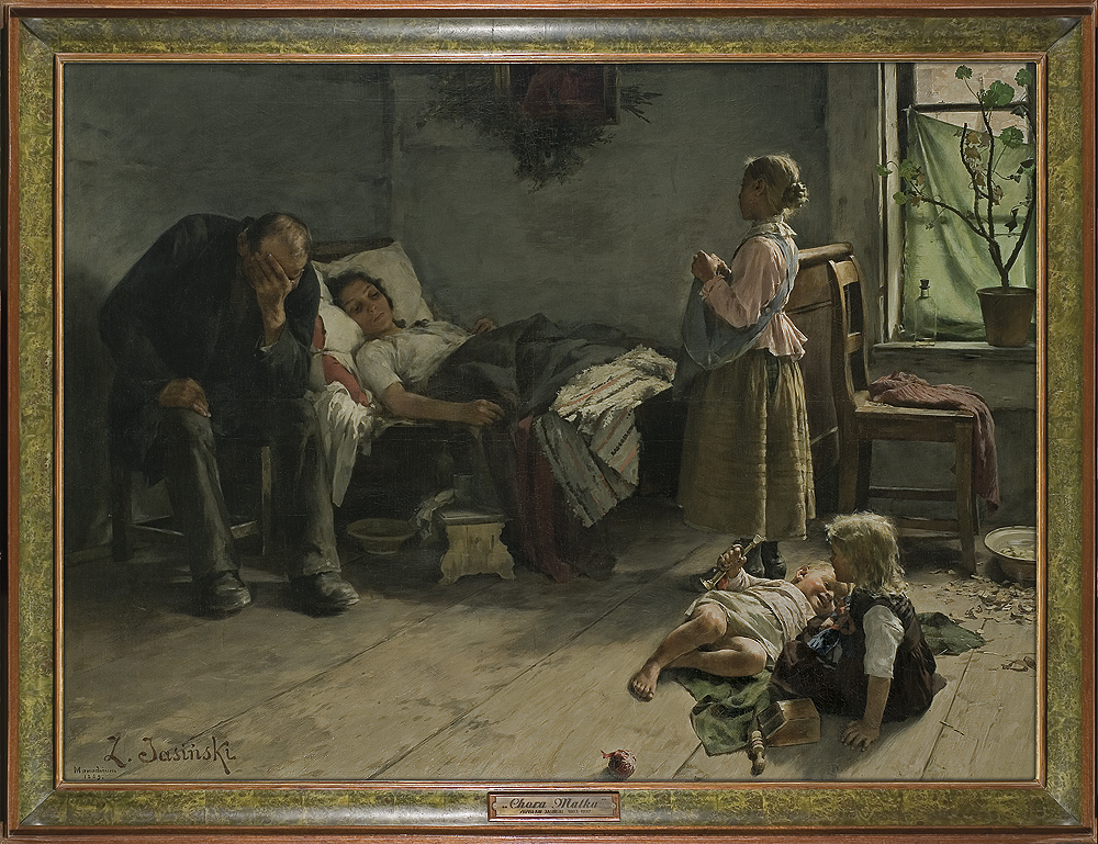 Zdzisław Jasiński (Warszawa 1863 – Warszawa 1932) pochodził z rodziny o artystycznych skłonnościach i tradycjach; ojciec prowadził firmę dekoratorską, brat był rzeźbiarzem. Naukę malarstwa rozpoczął pod okiem Wojciecha Gersona w warszawskiej Klasie Rysunkowej. Następnie studiował w Szkole Sztuk Pięknych w Krakowie u profesorów Leopolda Loefflera, Feliksa Szynalewskiego i Floriana Cynka, odwiedzając też pracownię Jana Matejki. Od 1885 kształcił się w Monachium pod kierunkiem Otto Seitza i Aleksandra Wagnera. W 1889 na wystawie akademickiej otrzymał wyróżnienie za Chorą matkę, obraz który w 1891 ponownie nagrodzono na międzynarodowej wystawie w Berlinie (złoty medal II klasy). Pokazywane na wielu wystawach obrazy artysty kilkakrotnie jeszcze nagradzano dyplomami i medalami, np. Nabożeństwo świąteczne nagrodzono na wystawie w warszawskiej Zachęcie (1891), na Światowej Wystawie w Chicago (1893) oraz na Międzynarodowej Wystawie w San Francisco i Los Angeles (1894), a Portret Antoniego Maleckiego uhonorowano medalem na Powszechnej Wystawie w Paryżu (1900). Po powrocie do kraju w roku 1893 artysta zamieszkał w Warszawie, włączając się w nurt polskiego życia artystycznego. Zajmował się wówczas także monumentalnym malarstwem dekoracyjnym; był m.in. autorem plafonu w Filharmonii Warszawskiej, polichromii w katedrze we Włocławku i kolegiacie w Kaliszu, malowideł w pałacyku w Białowieży i pałacach Petersburga. W 1897 podróżował do Włoch, a od 1904 mieszkał we własnym majątku w Przyłęku k. Garwolina, by w 1910 powrócić do Warszawy. W roku 1921 był jednym ze współzałożycieli stowarzyszenia artystycznego „Pro Arte”. Malował realistyczne sceny rodzajowe wyrosłe z tradycji szkoły monachijskiej, obrazy o treściach symbolicznych (Chmura karmicielka, Bańki mydlane) i alegorycznych (Rok 1920) oraz portrety, akty, kwiaty i pejzaże. Po roku 1900 tonacja jego obrazów ulega rozjaśnieniu, w pełni ujawniając wielką wrażliwość artysty na kolor.
