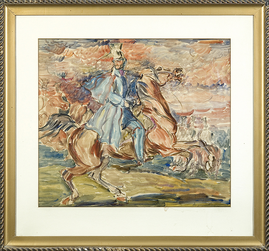 Eugeniusz Geppert (Lwów 1890 - Wrocław 1979) w latach 1912-14 i 1918-1920 studiował w krakowskiej Akademii Sztuk Pięknych pod kierunkiem Jacka Malczewskiego i Stanisława Dębickiego. Dyplom uzyskał w roku 1920. W latach 1925-1927 jako stypendysta ZPAP przebywał w Paryżu, dokąd i później wielokrotnie wyjeżdżał. W 1928 wrócił do kraju i zamieszkał w Krakowie. Należał do grup „Zwornik” i „Nowa Generacja”, był członkiem redakcji „Głosu Plastyków” oraz wiceprezesem i przedstawicielem Polski w „Confédération Internationale des Associations Plastiques”. Po wojnie osiadł na stałe we Wrocławiu, gdzie został profesorem Państwowej Wyższej Szkoły Sztuk Plastycznych, w różnych latach pełniąc funkcje dyrektora, rektora, kierownika pracowni malarskiej. W 1962 był współzałożycielem ugrupowania plastyków, tzw. „Szkoły Wrocławskiej”. Jednym z ulubionych motywów jego malarstwa byli jeźdźcy konni, przedstawiani tak w scenach historycznych, jak i współczesnych, batalistycznych i rodzajowych. Artysta nawiązywał tu do całej tradycji polskiego malarstwa, w szczególności do obrazów P. Michałowskiego. Malował także pejzaże, martwe natury i akty. Z czasem ciemna tonacja jego płócien uległa rozjaśnieniu, a kompozycja obrazów swoistej dekoracyjnej stylizacji w duchu malarstwa francuskiego, m.in. R. Dufy. Artysta brał udział w licznych wystawach – w okresie międzywojennym, podczas pobytu w Paryżu kilkakrotnie wystawiał na Salonie Jesiennym i w paryskich galeriach, później wielokrotnie w TPSP w Krakowie i Lwowie oraz w TZSP, IPS-ie i Salonie Garlińskiego w Warszawie. Swoje prace prezentował też za granicą, m.in. w 1938 na Międzynarodowej Wystawie Sztuki w Pittsburghu. Wiele wystaw miał też w okresie powojennym.