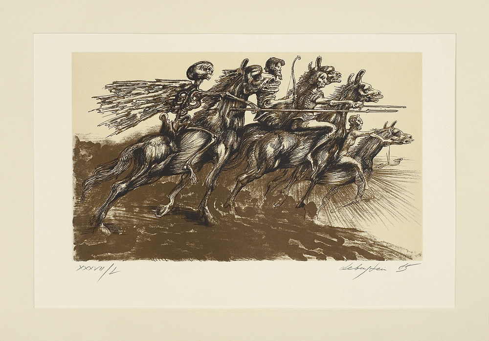 Jan Lebenstein (Brześć Litewski 1930 - Kraków 1999) w latach 1948-1954 studiował malarstwo w ASP w Warszawie pod kierunkiem prof. Eugeniusza Eibischa i Artura Nachta-Samborskiego. W 1955 wziął udział w wystawie w warszawskim Arsenale. Zaprzyjaźniony w czasie studiów z Mironem Białoszewskim, swą pierwszą wystawę indywidualną pokazał w 1956 w Teatrze na Tarczyńskiej. W 1959 zdobył Grand Prix de la Ville de Paris na I Biennale Młodych w Paryżu i w tym roku przeniósł się na stałe do Paryża. Po seriach "figur kreślonych" (na papierze milimetrowym) i "figur hieratycznych" z lat 1955-1958 maluje cykl "figur osiowych" (1958-1962), które wystawia w Paryżu i USA. Równolegle w 1960 zaczyna rysowane "karnety", rodzaj dziennika, który w przyszłości dostarczy motywów wykorzystanych w obrazach. W latach 1964-1965 maluje "Bestiarium", cykl fakturowych, archaizowanych stworów przypominających prehistoryczne wykopaliska. Bezpośrednio po nich wprowadza do swych obrazów postaci ludzkie i fantastyczne, odgrywające sceny ni to mitologiczne, ni to ze snu, często przesycone erotyką. W 1970 projektuje witraże dla Centre du Dialogue w Paryżu. W W 1971 otrzymuje obywatelstwo francuskie 1974 powstają gwasze inspirowane Folwarkiem zwierzęcym George'a Orwella. W latach 1976-1989 tworzy wyłącznie w technice gwaszu i pastelu, podejmując tematykę mitologiczną i zaczerpniętą z Biblii: cykle ilustracji do Księgi Hioba (wyd. 1979) i do Apokalipsy (wyd. 1986) w nowych przekładach Czesława Miłosza. W 1989 powraca do malarstwa olejnego (cykl "Pergamon"). Artysta otrzymał m. in. nagrodę Fundacji im. Alfreda Jurzykowskiego w 1976, Nagrodę Muzeum Archidiecezji Warszawskiej w 1985, Nagrodę im. Jana Cybisa w 1987.
