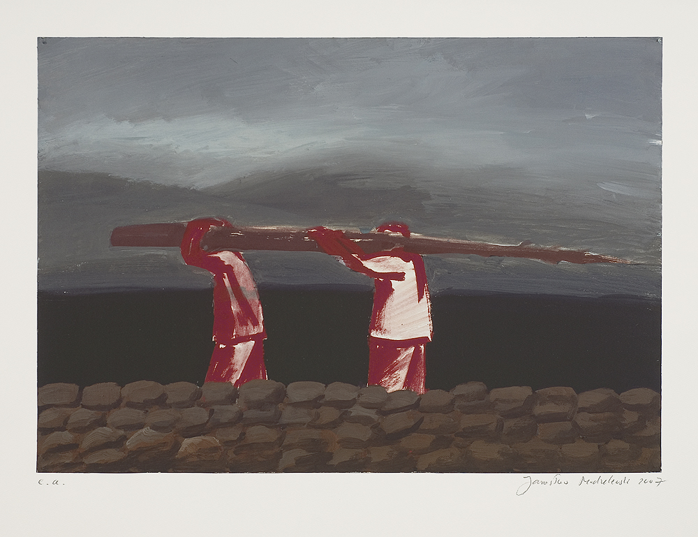 Jarosław Modzelewski (Warszawa 1955, mieszka w Warszawie) studiował malarstwo w ASP w Warszawie w latach 1975-1980, uzyskując dyplom w pracowni Stefana Gierowskiego. Od 1982 pracuje jako pedagog na macierzystym wydziale. W 1982 był współzałożycielem „Gruppy”, najważniejszego ugrupowania nurtu nowej ekspresji lat 80., działającego do 1992. W latach 1991-1996 wspólnie z Markiem Sobczykiem prowadził prywatną Szkołę Sztuki w Warszawie. Od wielu lat współpracuje z Galerią Zderzak w Krakowie. W początkowym okresie twórczości skłaniał się ku abstrakcji, wykorzystywał uproszczone znaki i emblematy oraz sylwetki odbite z szablonu. W 1985 namalował cykl oparty na ilustracjach do podręczników języka rosyjskiego, obrazujący proste czynności, których czasownikowe określenia stanowią tytuły prac. W 1986-1989 powstawały obrazy utrzymane w konwencji realistycznej, jednak zarazem o surrealnej atmosferze uzyskiwanej różnymi metodami, np. przez dublowanie figur, ukazywanie postaci w sytuacji niepewności czy zagrożenia, zabiegi z przestrzenią. W grupie obrazów z 1988 artysta rezygnuje z postaci ludzkiej na rzecz wyjątkowego nasycenia emocją samej przestrzeni pejzaży i wnętrz. Około 1990 wraca do kompozycji akcentujących czynności wykonywane przez postaci, które często umieszczone są w pustej, zaledwie zasugerowanej, acz dominującej przestrzeni. Odrealnienia i monumentalności dodaje tym obrazom płaskie i rozległe kładzenie koloru.