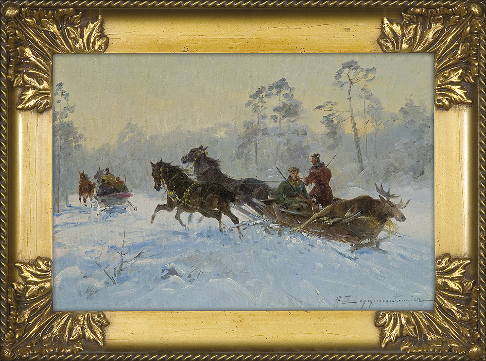 Czesław Wasilewski (ok. 1875 - Warszawa/ Łódź 1946?47) to popularny w okresie międzywojennym warszawski malarz, autor obrazów inspirowanych płótnami Kossaka, Brandta, Chełmońskiego, Wierusza-Kowalskiego czy Fałata. Był samoukiem; wprawdzie w 1911 zapisał się do warszawskiej Szkoły Sztuk Pięknych, ale o jego studiach nic bliższego nie wiadomo. Być może uczęszczał tam (1913-1917) do pracowni Wojciecha Kossaka, dla którego później, na początku lat dwudziestych, przygotowywał podmalówki do obrazów. Uczestniczył w wystawie w Lublinie (1922), wystawiał na Salonach warszawskiej Zachęty (1925,1926, 1927), w Katowicach (1926), Częstochowie (1927), Gdyni (1929), Kaliszu (1931), Poznaniu (1928, 1931). Malował przede wszystkim liczne zaprzęgi, sanny, wyjazdy na polowania, wypadki w podróży, ułanów na patrolu, łosie, sarny i dziki w lesie. Tworzył także nastrojowe pejzaże, wyraźnie inspirowane malarstwem J. Chełmońskiego Rzadziej malował także kwiaty i martwe natury. Utożsamiany z malarzem o nazwisku „Zygmuntowicz”, którego prace pojawiały się na rynku sztuki od trzydziestych lat XX wieku. Stawiany przed tym nazwiskiem inicjał I. lub F., sugerować może imię Ignacy lub Franciszek. Sylwetkę malarza bliżej omówił S. Bołdok w artykule Malarz o dwóch nazwiskach (Art and Business 1992, nr 7-8, s. 48-49).