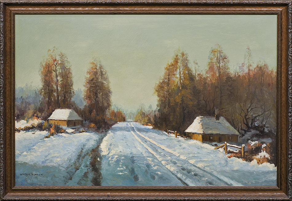 Wiktor Korecki (Kamieniec Podolski 1890 - Komorów k. Warszawy 1980) - malarz pejzażysta - gimnazjum ukończył w Kijowie, tam też studiował w Szkole Rysunkowej Aleksandra Muraszki. Po studiach wrócił do Kamieńca Podolskiego, skąd w roku 1921 wyjechał do Warszawy. Tu miał pracownię na rogu ulic Tamki i Cichej. Niestety zgromadzone tam obrazy spłonęły w czasie powstania 1944 roku. Po powstaniu artysta przebywał w obozie w Pruszkowie skąd trafił do obozu pracy w Lipsku. Do kraju powrócił w roku 1946 i zamieszkał w Komorowie pod Warszawą, a później w Milanówku. Jego nastrojowe krajobrazy emanujące spokojem i pogodą cieszyły się zawsze dużą popularnością. Korecki najczęściej malował pejzaże zimowe z motywem leśnej drogi i strumienia wijącego się wśród śniegów, a obok nich także wiosenne, letnie czy jesienne widoki z Mazowsza.
