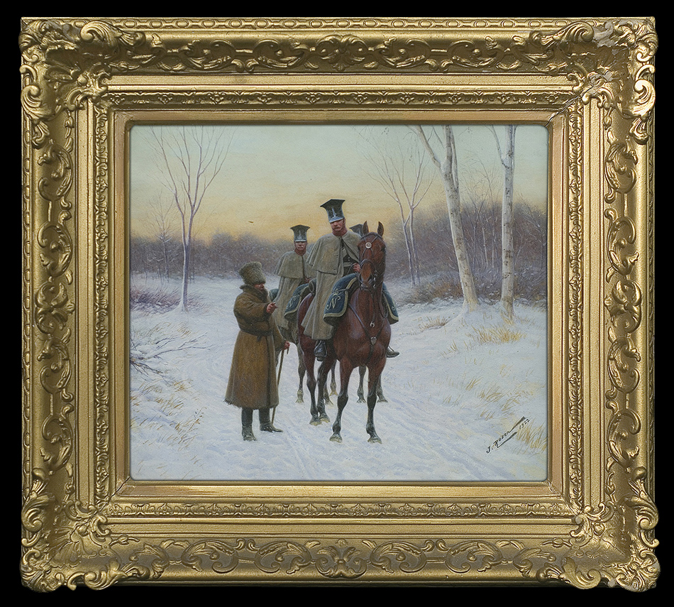 Jan Rosen (Warszawa 1854 - Warszawa 1936), popularny malarz-batalista, pierwsze lekcje rysunku pobierał już w dzieciństwie - u Henryka Redlicha w Dreźnie i Franciszka Kostrzewskiego w Warszawie. Później, w latach 1872-1874 studiował w Monachium - w Akademii pod kierunkiem Alexandra Strähubera i rzeźbiarza Ferdinanda Bartha oraz w prywatnej pracowni Józefa Brandta, a w latach 1875-1879 w École des Beaux-Arts w Paryżu u Isidora Pilsa i Jean-Léona Gerome’a. Długo przebywał poza krajem, wiele podróżował; mieszkał w Monachium, Paryżu, Lozannie. W roku 1891 został nadwornym malarzem dworu petersburskiego. Do kraju wrócił w roku 1921; początkowo mieszkał na wsi, później w Warszawie i we Lwowie. Wyjeżdżał także do Włoch. Malował przede wszystkim obrazy o tematyce wojskowej, sceny batalistyczne z czasów napoleońskich i powstania listopadowego oraz obrazy rodzajowe z ulubionym motywem jeźdźców i koni.