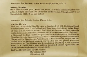 Walter Heimig (Wesel 1880 - Bad Ems 1955) - niemiecki malarz i litograf; studiował w ASP w Düsseldorfie u profesorów Clausa Meyera i Eduarda von Gebhardta. Później kształcił się jeszcze w Paryżu. W czasie I wojny światowej służył w armii na froncie wschodnim. W tym czasie wykonał wiele rysunków o zabarwieniu humorystycznym. Od 1907 uczestniczył w Wielkich Berlińskich Wystawach Sztuki, w dorocznych wystawach w Düsseldorfie, wystawiał też w Glaspalast w Monachium, w Kolonii, Wiesbaden, Stuttgarcie. Malował obrazy ołtarzowe do kościołów, m.in. Chrystusa Ukrzyżowanego do kościoła w Vohl-Marienhagen. Malował także barwne pejzaże, mariny, akty i sceny figuralne, w tym charakterystyczne damy w krynolinach, obrazy wyróżniające się wyrafinowanym kolorytem, będące dalekim nawiązaniem do osiemnastowiecznego malarstwa weneckiego (Pietro Longhi). Obrazy artysty znajdują się, m.in. w zbiorach muzeum w Düsseldorfie.