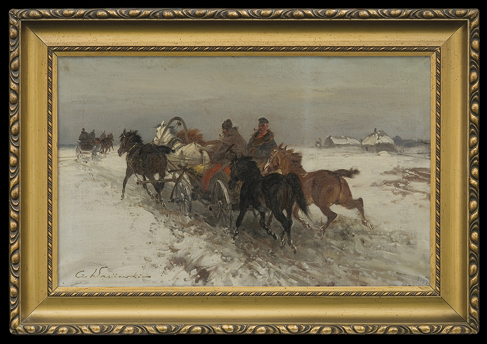 Czesław Wasilewski (ok. 1875 - Warszawa/ Łódź 1946?47) to popularny w okresie międzywojennym warszawski malarz, autor obrazów inspirowanych płótnami Kossaka, Brandta, Chełmońskiego, Wierusza-Kowalskiego czy Fałata. Był samoukiem; wprawdzie w 1911 zapisał się do warszawskiej Szkoły Sztuk Pięknych, ale o jego studiach nic bliższego nie wiadomo. Być może uczęszczał tam (1913-1917) do pracowni Wojciecha Kossaka, dla którego później, na początku lat dwudziestych, przygotowywał podmalówki do obrazów. Uczestniczył w wystawie w Lublinie (1922), wystawiał na Salonach warszawskiej Zachęty (1925,1926, 1927), w Katowicach (1926), Częstochowie (1927), Gdyni (1929), Kaliszu (1931), Poznaniu (1928, 1931). Malował przede wszystkim liczne zaprzęgi, sanny, wyjazdy na polowania, wypadki w podróży, ułanów na patrolu, łosie, sarny i dziki w lesie. Tworzył także nastrojowe pejzaże, wyraźnie inspirowane malarstwem J. Chełmońskiego Rzadziej malował także kwiaty i martwe natury. Utożsamiany z malarzem o nazwisku „Zygmuntowicz”, którego prace pojawiały się na rynku sztuki od trzydziestych lat XX wieku. Stawiany przed tym nazwiskiem inicjał I. lub F., sugerować może imię Ignacy lub Franciszek. Sylwetkę malarza bliżej omówił S. Bołdok w artykule Malarz o dwóch nazwiskach (Art and Business 1992, nr 7-8, s. 48-49).