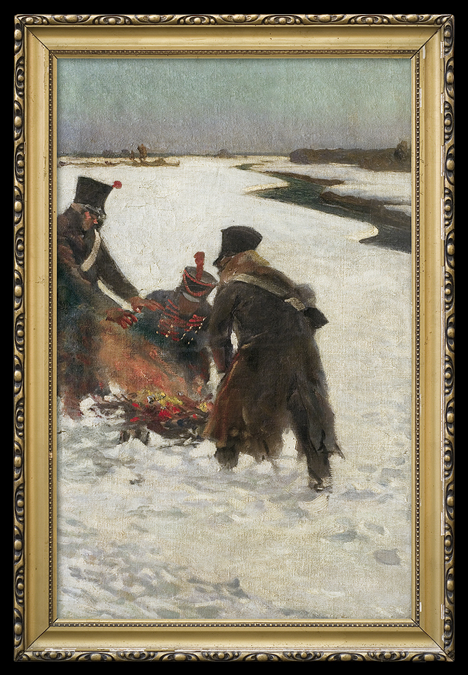 Panoramę Berezyna, przedstawiającą dramatyczny odwrót wojsk Wielkiej Armii spod Moskwy i ich przejście przez Berezynę w dniu 28 listopada 1812, malował Wojciech Kossak, wspólnie z Julianem Fałatem i zespołem, od grudnia 1894 do kwietnia 1896 r. Kossak (któremu pomagał Kazimierz Pułaski) był autorem niemal całości kompozycji figuralnej; Fałat namalował grupę przy moście dla pieszych i cały pejzaż (przy współpracy Jana Stanisławskiego, Antoniego Piotrowskiego i Michała Wywiórskiego). Ukończoną panoramę wystawiono w roku 1896 w Berlinie, w 1898 w Warszawie, w 1900 w Kijowie i rok później w Moskwie. Przez kilka następnych lat ogromne płótno [15 x 120 m], zwinięte na wałki, niszczało w Krakowie, aż wreszcie w roku 1907, pod kierunkiem samego Kossaka, zostało pocięte na części. Poszczególne fragmenty - po konserwacji, koniecznych uzupełnieniach, a najczęściej także przemalowaniu partii pejzażu - sprzedawane były później jako samodzielne obrazy. Dziś znamy kilkanaście takich wycinków Berezyny, przechowywanych, m.in. w Muzeach Narodowych w Warszawie i Krakowie, w Lublinie i Opolu. Prezentowany tu fragment pochodzi z dalszego tła kompozycji w części przedstawiającej Colonne mourante, kolumnę rannych, resztkami sił idących żołnierzy. Obraz złożony jest z dwóch oryginalnych wycinków panoramy: części dolnej z żołnierzami i górnej z niebem i linią lasu na horyzoncie. Scala je namalowana na nowo partia pejzażu z rzeką wijącą się wśród śniegów.
