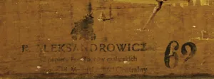 Na krośnie 3 stemple: R. ALEKSANDROWICZ | Skład papieru i przyborów malarskich | w Krakowie, Pl. Matejki. Hotel Centralny. Ponadto stemple odnoszące się do wymiarów krosna - odpowiednio: 99 i 62.