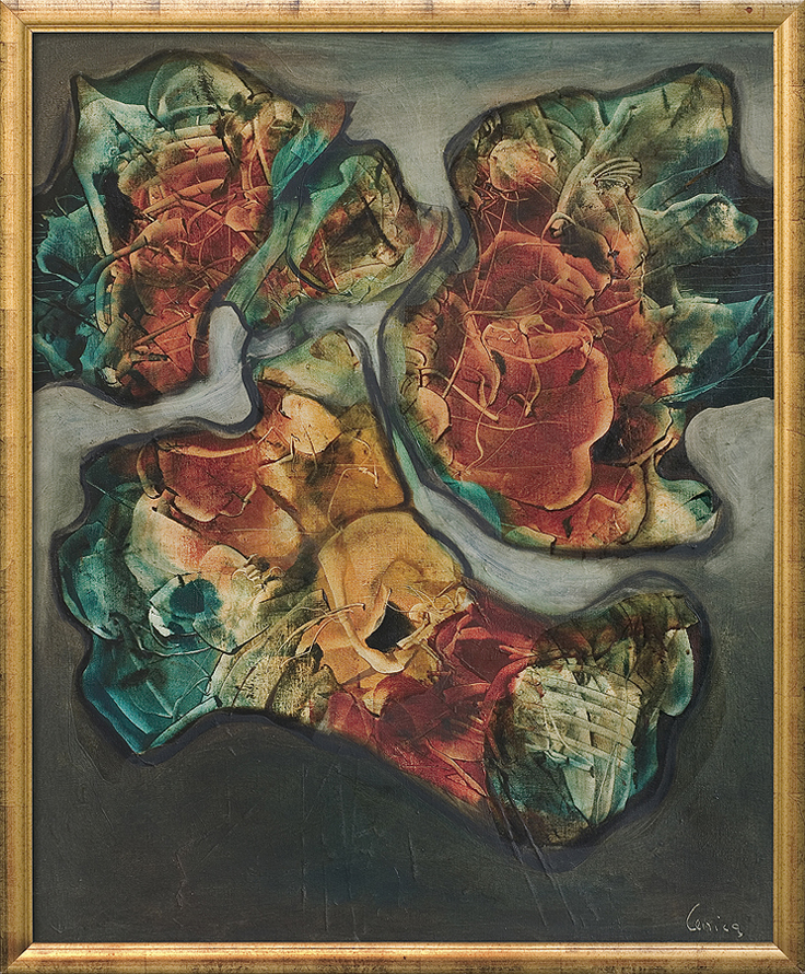 Alfred Lenica (Pabianice 1899 - Warszawa 1977) uczył się prywatnie rysunku i malarstwa w pracowniach Artura Hannytkiewicza i Piotra Kubowicza w Poznaniu (1925-1928). W latach 30. malował obrazy figuratywne, nawiązujące w stylistyce do kubizmu. Nieco później uległ wpływom surrealizmu, który, pomijając lata socrealizmu, stanie się dlań najpoważniejszym obszarem poszukiwań malarskich. Od połowy lat 40. utrzymywał stałe kontakty z kręgiem „Grupy Krakowskiej“, przyjaźnił się z Jerzym Kujawskim. Po przeniesieniu się do Poznania, w 1947 został współzałożycielem awangardowej grupy „4F+R“ (farba, forma, fantastyka, faktura + realizm). Jest autorem pierwszego polskiego obrazu taszystowskiego (Farby w ruchu, 1949, tempera). W okresie socrealizmu włączył się w nurt oficjalnej sztuki, pracując jednocześnie jako organizator życia artystycznego, prezes Okręgu Poznańskiego ZPAP (1948-1950) i jednocześnie kierownik Pracowni Sztuk Plastycznych tamże. W końcu lat 50. przeniósł się do Warszawy i również tu do 1969 pełnił kierownicze funkcje w ZPAP. W drugiej poł. lat 50. ponownie - po eksperymentach z lat 40. - uprawiał informel, malując chętnie techniką drippingu. Około 1958 wypracował indywidualny, charakterystyczny dlań styl wirujących, kolorowych, niekiedy kaligraficznie opracowanych form, które dynamicznie wypełniały pola obrazów. Tworzył je techniką zbliżoną do surrealistycznej dekalkomanii. Styl ten stał się znakiem rozpoznawczym artysty do końca życia. W swych obrazach nie unikał kształtów nawiązujących do form naturalnych (jego malarstwo nazywano „biologicznym“), a w latach 70. niekiedy włączał do kompozycji motywy figuralne. Wystawa retrospektywna artysty odbyła się w Galerii Zachęta w Warszawie w 1974.