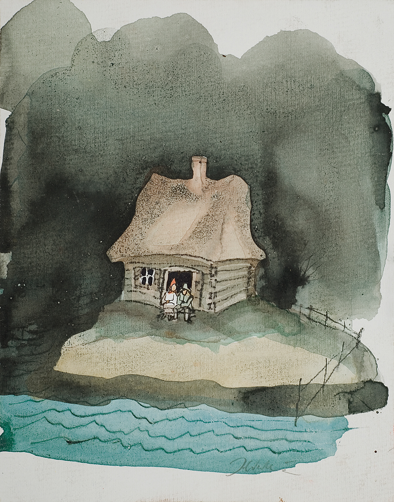 akwarela, kredka, tusz, szych złoty, karton