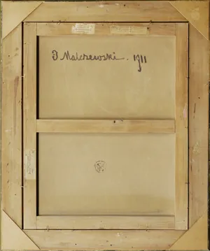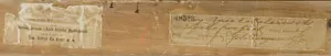 Na krośnie trzy nalepki wystaw w TPSP w Krakowie w roku 1911, TZSP w Warszawie w 1911 oraz wystawy na rzecz Tow. Ochron dla Dzieci wyznania mojżeszowego w Warszawie w 1916 (druk, atrament, stempel) o treści: