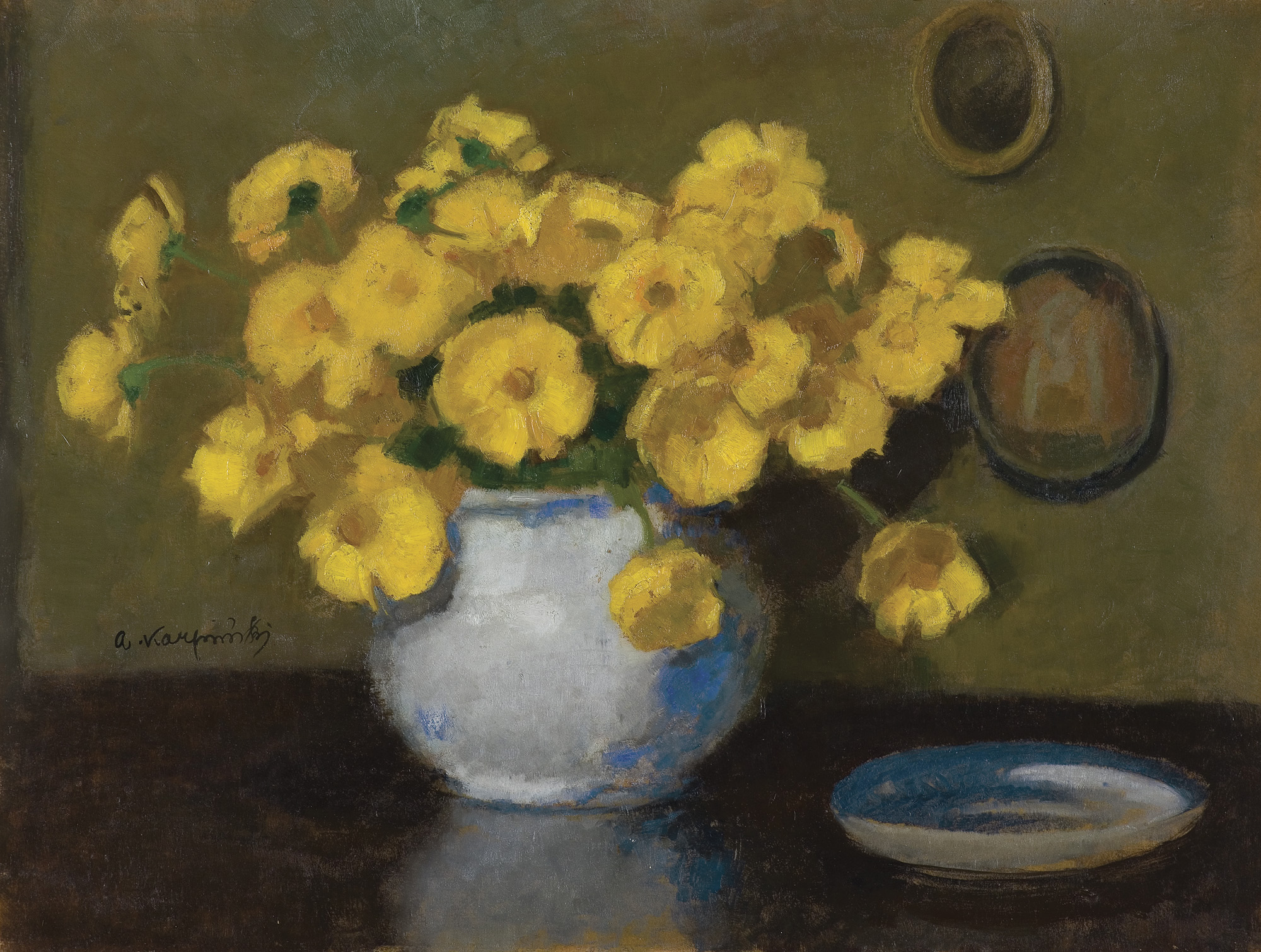 Alfons Karpiński (Rozwadów, dziś dzielnica Stalowej Woli 1875 - Kraków 1961) w latach 1891-1899 studiował w krakowskiej Szkole Sztuk Pięknych pod kierunkiem Floriana Cynka, Izydora Jabłońskiego, Władysława Łuszczkiewicza i Leona Wyczółkowskiego, a następnie kształcił się jeszcze u Antona Ažbégo w Monachium (1903), u Kazimierza Pochwalskiego w Wiedniu, a od 1907 także w Paryżu. Podróżował do Włoch i Londynu. Stale mieszkał w Krakowie; związany z tamtejszym środowiskiem skupionym wokół „Zielonego Balonika” projektował dekoracje do przedstawień kabaretu. Należał do Tow. Artystów Polskich „Sztuka”, grupy „Zero”, był członkiem wiedeńskiego stowarzyszenia „Secesja” i krakowskiego TPSP. Uczestniczył w wielu wystawach w kraju i za granicą. W czasie I wojny światowej służył w armii austriackiej. Na bogatą twórczość artysty składają się wczesne sceny rodzajowe z podkrakowskiej wsi, pejzaże i portrety, wśród nich zwłaszcza portrety kobiece, które przyniosły mu szczególną popularność. Z czasem głównym – obok portretu – tematem jego obrazów stały się martwe natury z kwiatami, dekoracyjne kompozycje o stonowanej gamie barwnej. Artysta zajmował się także grafiką i ilustratorstwem.