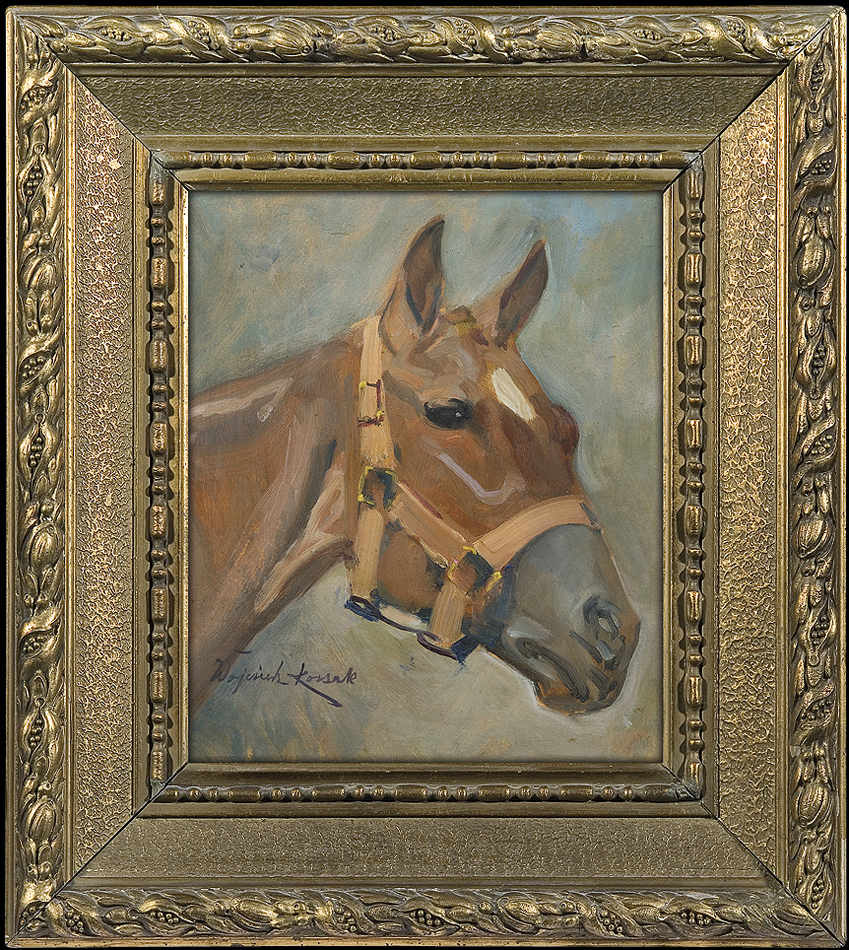 Wojciech Kossak (Paryż 1856 - Kraków 1942 ) – powszechnie znany malarz, postrzegany przede wszystkim jako świetny batalista. Syn i uczeń Juliusza Kossaka kształcił się w krakowskiej Szkole Sztuk Pięknych, w Akademii monachijskiej oraz w Paryżu. W latach 1895-1902 przebywał głównie w Berlinie, pracując dla cesarza Wilhelma II. Wiele podróżował, m.in. do Hiszpanii i Egiptu, gdzie wykonywał szkice do zamierzonych panoram. W późniejszych latach kilkakrotnie wyjeżdżał do Stanów Zjednoczonych wykonując zamówienia portretowe. W 1913 był mianowany profesorem warszawskiej Szkoły Sztuk Pięknych. W latach I wojny światowej pełnił służbę wojskową. Był współautorem panoram: „Racławice” (1893-1894), „Berezyna” (1895-1896), „Bitwa pod piramidami” (1901) oraz szkiców do niezrealizowanej „Somosierry” (1900). Z temperamentem i swobodą tworzył szeroko malowane, dynamiczne sceny batalistyczne, historyczne, rodzajowe oraz liczne portrety. Z upodobaniem malował konie. Jego obrazy, gloryfikujące dawne i współczesne artyście polskie wojsko i bohaterstwo żołnierzy, trafiały do patriotycznych uczuć odbiorców i cieszyły się ogromna popularnością.