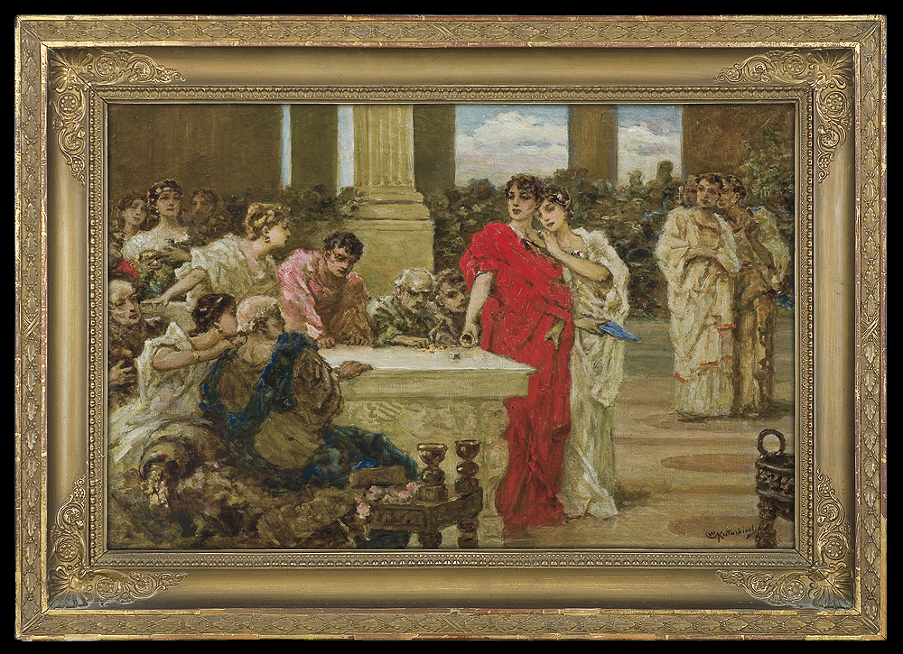 Wilhelm Kotarbiński (Nieborów 1849 – Kijów 1921) kształcił się w warszawskiej Klasie Rysunkowej pod kierunkiem Rafała Hadziewicza (lata1867-1871), a od roku 1872 także w Akademii Św. Łukasza w Rzymie. Po ukończeniu studiów otworzył w Rzymie własną pracownię, w której udzielał także lekcji rysunków; jego uczennicą była m.in. Maria Baszkircew. Do kraju wrócił w 1888 i odtąd przebywał głównie we własnym majątku Kalsk (lub Kulsk) na Białorusi. Stamtąd wielokrotnie wyjeżdżał do Kijowa, gdzie miał pracownię w hotelu Praga, uczestniczył w wystawach kijowskiego Tow. Artystycznego, a w 1893 był współzałożycielem Tow. Malarzy Kijowskich. Wraz z P. Swiedomskim, M. Niestierowem i M. Wrublem pracował przy dekoracji freskami kijowskiego soboru Św. Włodzimierza (ukończone 1894-1895). Był także autorem dekoracyjnych plafonów i malowideł ściennych m.in. w domu M. Tereszczenki i w pałacu B. Chanenki w Kijowie oraz w salonach pałaców w Petersburgu i Moskwie. Malował przede wszystkim kompozycje o tematach biblijnych bądź antycznych – z życia starożytnego Wschodu, Grecji i Rzymu; tworzył też pejzaże oraz sceny fantastyczne i symboliczne. Jego obrazy wyróżniają się wyrafinowaną kolorystyką, swobodną techniką, swoistą stylizacją form i specyficznym, często tajemniczym nastrojem. Największa popularność artysty przypada na dziewięćdziesiąte lata XIX wieku, kiedy – ze względu na „antyczną” tematykę swych obrazów – bywał porównywany z Siemiradzkim. Dzieła Kotarbińskiego rzadko pojawiają się na rynku sztuki; większość jego prac zaginęła bądź uległa zniszczeniu w czasie pierwszej wojny światowej i rewolucji bolszewickiej.