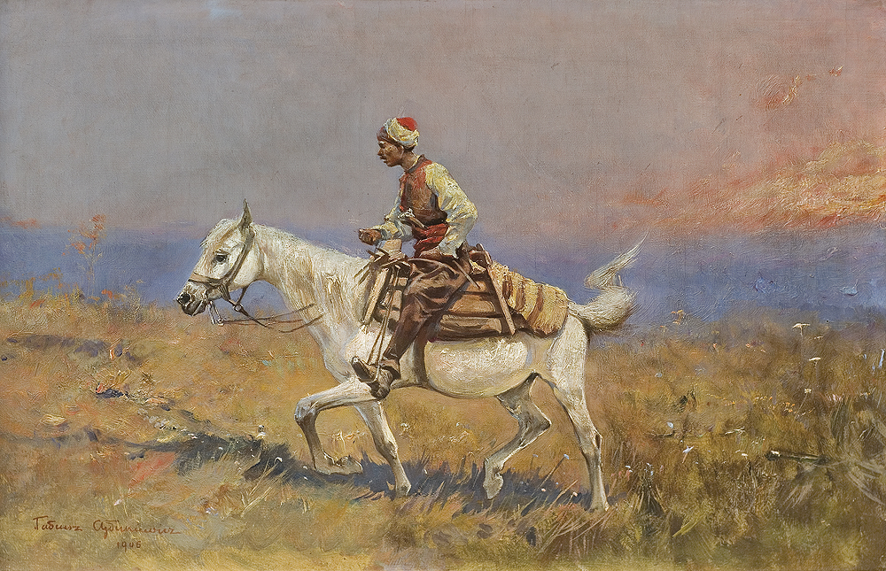 Tadeusz Ajdukiewicz (Bochnia 1851 - Kraków 1916) był artystą związanym z mecenatem arystokracji i dworów panujących; w tych kręgach zrobił prawdziwą karierę, a jego obrazy podobały się powszechnie. Studia malarskie rozpoczął w krakowskiej Szkole Sztuk Pięknych. Później kształcił się jeszcze w Wiedniu oraz w Monachium - w Akademii i w pracowni Józefa Brandta. Po studiach przez kilka lat jeździł po polskich dworach kresowych i malował portrety. Około 1877 wyjechał do Paryża, skąd, wraz z Władysławem Branickim wyjechał w – ważną dla jego przyszłej twórczości – podróż na Bliski Wschód. Około roku 1882 zamieszkał w Wiedniu, zajął pracownię po Hansie Makarcie (zm. 1884), malując dla dworu cesarskiego i arystokracji. W 1893 bawił w Londynie, gdzie, m.in. portretował księcia Walii, w 1894 pracował na dworze sułtańskim w Konstantynopolu, następnie także w Sofii, Petersburgu i Bukareszcie. W Rumunii osiadł na dłużej jako malarz nadworny Karola I. Po wybuchu I wojny światowej powrócił do kraju i, mimo starszego wieku, zaciągnął się do Legionów. Zmarł, nie wytrzymawszy trudów wojennych. Malował przede wszystkim portrety - zarówno reprezentacyjne, efektowne i eleganckie (Portret Heleny Modrzejewskiej, MNK), jak również skromne i kameralne. Tworzył też sceny myśliwskie, obrazy o tematyce wschodniej, bohaterskie sceny bitewne, rewie i przeglądy wojsk (Przegląd armii rumuńskiej, 1896).