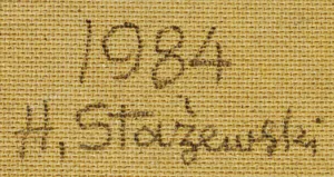 Henryk Stażewski (Warszawa 9 I 1894 - Warszawa 10 VI 1988) studiował w Szkole Sztuk Pięknych w Warszawie w latach 1913-1920. W początkach kariery malował martwe natury. Przejściowo wystawiał z ugrupowaniem „Formiści” (1922). Wziął też udział w Wystawie Nowej Sztuki w Wilnie w 1923. O tego czasu tworzył pod wpływem konstruktywizmu. Obok kompozycji malarskich trudnił się grafiką książkową, projektował wnętrza, sprzęty, a także scenografie – były to w większości prace teoretyczne i studyjne. Polskie i międzyna-rodowe ugrupowania awangardy, z którymi wystawiał i współpracował jako publicysta, to kolejno: „Blok” (1924-1926), „Praesens” (1926-1930), „Cercle et Carré” (1929-1931), „Abstraction-Création” (1931-1939), „a. r.” (1932-1939). Należał też do Koła Artystów Grafików Reklamowych (1933-1939). W 1930 był współorganizatorem zbiórki dzieł artystów międzynarodowej awangardy przeznaczonych dla muzeum łódzkiego (obecnie w Muzeum Sztuki w Łodzi). Po II wojnie mieszkał i działał w Warszawie. W latach 40. i 50. podejmował próby dostosowania się do postulatów sztuki figuratywnej. Z tego okresu pochodzą rysunkowe i malarskie kompozycje o tematyce pracy, budowy, a także projekty monumentalne. Po 1956, uznawany powszechnie za patrona polskiej awangardy, uprawiał już wyłącznie abstrakcję o konstruktywistycznym rodowodzie. Tworzył cykle prac, będących studiami płaszczyzn, linii, kolorów w różnych układach względem siebie. Przy pozorach chłodnej perfekcji umiał nasycić je emocją bezpośredniego dotknięcia, śladu ręki. Obok malarstwa i form pochodnych, jak collages, reliefy, multiple, tworzył formy przestrzenne i grafikę (autoryzował serigraficzne repliki swoich prac). Był laureatem wielu nagród i odznaczeń krajowych i zagranicznych, w tym Nagrody Herdera, Wiedeń 1972.