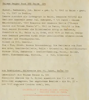 Nathaniel Sichel (Mainz 1843 - Berlin 1907) - niemiecki malarz i rysownik, portrecista. Studiował w Akademii Sztuk Pięknych w Berlinie pod kierunkiem Juliusa Schradera. Następnie spędził dwa lata w Rzymie, a przez rok był w Paryżu. Podróżował po Niemczech, przez dłuższy czas ponownie mieszkał w Paryżu, by w końcu osiąść w Berlinie. Malował przede wszystkim portrety, w tym szczególnie chętnie portrety kobiet często stylizowanych na „piękności orientalne“.