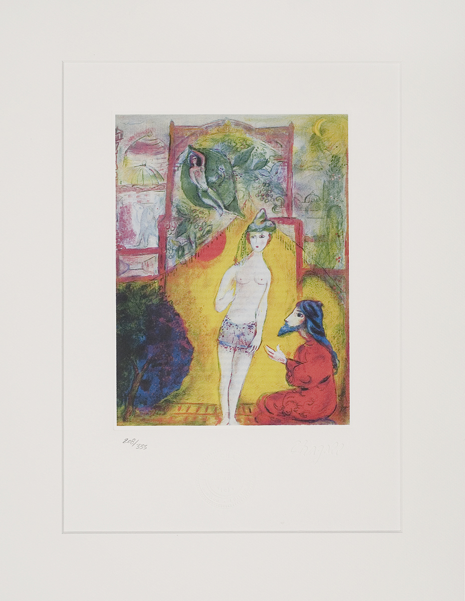 Marc Chagall uczył się rysunku u witebskiego malarza nazwiskiem Juda Pen, następnie od 1907 studiował w Akademii petersburskiej. W 1910 wyjechał na stypendium do Paryża. Zamieszkał w La Ruche na Montparnassie, wszedł do kręgu artystów, wśród których byli m.in. Modigliani, Soutine, Delaunay. W 1914 wrócił do Witebska, w 1915 poślubił Bellę (zm. 1944), muzę i bohaterkę wielu obrazów. W latach 1915-1917 mieszkał w Sankt Petersburgu, gdzie zastała go rewolucja. Mianowany komisarzem sztuk pięknych na obszar Witebska, założył tam i prowadził w latach 1918-1919 szkołę artystyczną, której profesorami byli m.in. Kazimierz Malewicz i El Lissitzky. W 1919 przeniósł się do Moskwy, gdzie do 1922 był kierownikiem artystycznym Państwowego Teatru Żydowskiego. W 1923 ostatecznie opuścił Rosję, osiedlając się w Paryżu. We Francji spędził resztę życia, z przerwą w latach 1941-1947, kiedy to schronił się w Nowym Jorku. Jego styl, wykształcony w młodości niezależnie od równoległych kierunków w sztuce, pozostał w ciągu życia artysty mało zmieniony. Wyobraźnia i sposób obrazowania Chagalla, zbliżone do sztuki naiwnej, wpisały się najsilniej w nurt surrealizmu, stając się jego znaczącym rozszerzeniem. Chagall łączył poetyckość i cudowność swych fantazji z rozwiniętym warsztatem malarza-kolorysty. Był też utalentowanym i płodnym grafikiem (cykle ilustracji do "Martwych dusz" Gogola, 1923-1927, "Bajek" La Fontaine’a, 1927-1930, Biblii, 1931-1955 – każdy cykl liczył ponad 100 plansz w technikach metalowych). Zajmował się scenografią (projekty dla Metropolitan Opera w Nowym Jorku, 1945, Opery w Paryżu, 1958), malarstwem monumentalnym (plafon w Operze paryskiej, 1963-1964), projektował witraże, dekoracje ceramiczne.