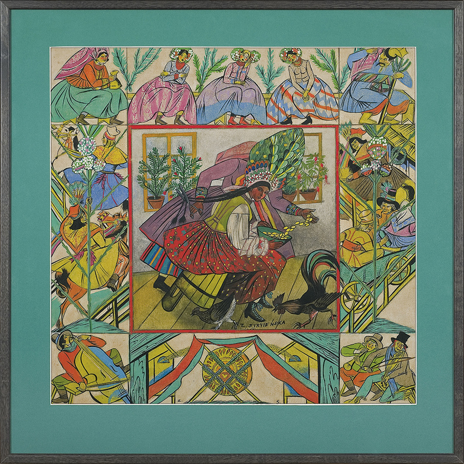 Zofia Stryjeńska, z domu Lubańska (Kraków 1891 - Genewa 1976) - malarka, ilustratorka, scenograf - była jedną z barwniejszych postaci polskiego środowiska artystycznego w dwudziestoleciu międzywojennym. Po krótkim okresie nauki u Leonarda Stroynowskiego i w krakowskiej szkole Marii Niedzielskiej wyjechała do Monachium, gdzie w latach 1911-1912 w męskim przebraniu studiowała w Akademii Sztuk Pięknych (kobiet wówczas na studia nie przyjmowano). Debiutowała w krakowskim TPSP w roku 1912 cyklem kartonów Polskich bajd inspirowanych opowieściami ludowymi. W 1916 wyszła za mąż za Karola Stryjeńskiego. Do 1919 mieszkała w Krakowie, później w Paryżu, Krakowie, Zakopanem i Warszawie. W roku 1925 odniosła międzynarodowy sukces na Wystawie Sztuki Dekoracyjnej w Paryżu, otrzymując Gran Prix w czterech działach (malarstwo, plakat, tkanina, ilustracja) oraz Diplom d’Honneur za projekty zabawek. Zajmowała się dekoracyjnym malarstwem architektonicznym, polichromią, ilustratorstwem, scenografią (m.in. Harnasie Karola Szymanowskiego; 1938), wzornictwem przemysłowym (projekty kilimów, zabawek). Stworzyła własny specyficzny styl w dekoracyjnie stylizowanych, barwnych, pełnych dynamiki i temperamentu obrazach; temperach, akwarelach i gwaszach. W ich tematyce odwoływała się do legend, wierzeń, historii i obyczajowości ludowej. Wydała kilka tek graficznych (Bożki słowiańskie, 1917 i 1922) i albumów reprodukcji (Tańce polskie, 1927; Pascha, 1929; Piastowie, 1929; Gusła Słowian / Magie Slave, 1934). Jej prace popularyzowane były także przez liczne barwne pocztówki.