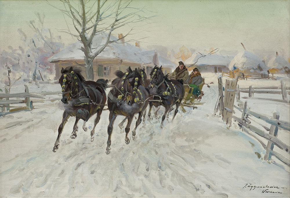 Czesław Wasilewski (ok. 1875 - Warszawa/ Łódź 1946?47) to popularny w okresie międzywojennym warszawski malarz, autor obrazów inspirowanych płótnami Kossaka, Brandta, Chełmońskiego, Wierusza-Kowalskiego czy Fałata. Był samoukiem; wprawdzie w 1911 zapisał się do warszawskiej Szkoły Sztuk Pięknych, ale o jego studiach nic bliższego nie wiadomo. Być może uczęszczał tam (1913-1917) do pracowni Wojciecha Kossaka, dla którego później, na początku lat dwudziestych, przygotowywał podmalówki do obrazów. Uczestniczył w wystawie w Lublinie (1922), wystawiał na Salonach warszawskiej Zachęty (1925,1926, 1927), w Katowicach (1926), Częstochowie (1927), Gdyni (1929), Kaliszu (1931), Poznaniu (1928, 1931). Malował przede wszystkim liczne zaprzęgi, sanny, wyjazdy na polowania, wypadki w podróży, ułanów na patrolu, łosie, sarny i dziki w lesie. Tworzył także nastrojowe pejzaże, wyraźnie inspirowane malarstwem J. Chełmońskiego Rzadziej malował także kwiaty i martwe natury. Utożsamiany z malarzem o nazwisku „Zygmuntowicz”, którego prace pojawiały się na rynku sztuki od trzydziestych lat XX wieku. Stawiany przed tym nazwiskiem inicjał I. lub F., sugerować może imię Ignacy lub Franciszek. Sylwetkę malarza bliżej omówił S. Bołdok w artykule Malarz o dwóch nazwiskach (Art and Business 1992, nr 7-8, s. 48-49).
