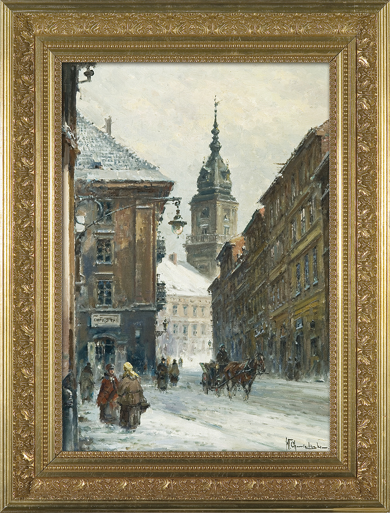 Władysław Chmieliński (Warszawa 1911 - Warszawa 1979) był malarzem związanym z Warszawą, gdzie stale mieszkał i pracował. W latach 1926-1931 studiował w warszawskiej Miejskiej Szkole Sztuk Zdobniczych i Malarstwa (dawna Klasa Rysunkowa). Wiodącym tematem jego obrazów były widoki miejskie, malowane olejno i akwarelą. W latach 1935-1938 stworzył cykl akwarel przedstawiających obiekty polskiej architektury; wśród nich, widoki Sandomierza, Krakowa, Kazimierza nad Wisłą, a także wnętrza zabytkowych kościołów czy pałaców, m.in. Zamku Królewskiego w Warszawie i Pałacu w Wilanowie. Malował także pejzaże i wiejskie sceny rodzajowe – kuligi, sanny, zaprzęgi, wesela, konie na tle krajobrazu. W latach 1967-1969 wyjeżdżał na dłuższe pobyty do Danii. W latach 1936-1939 artysta używał także pseudonimu „Władysław Stachowicz”.