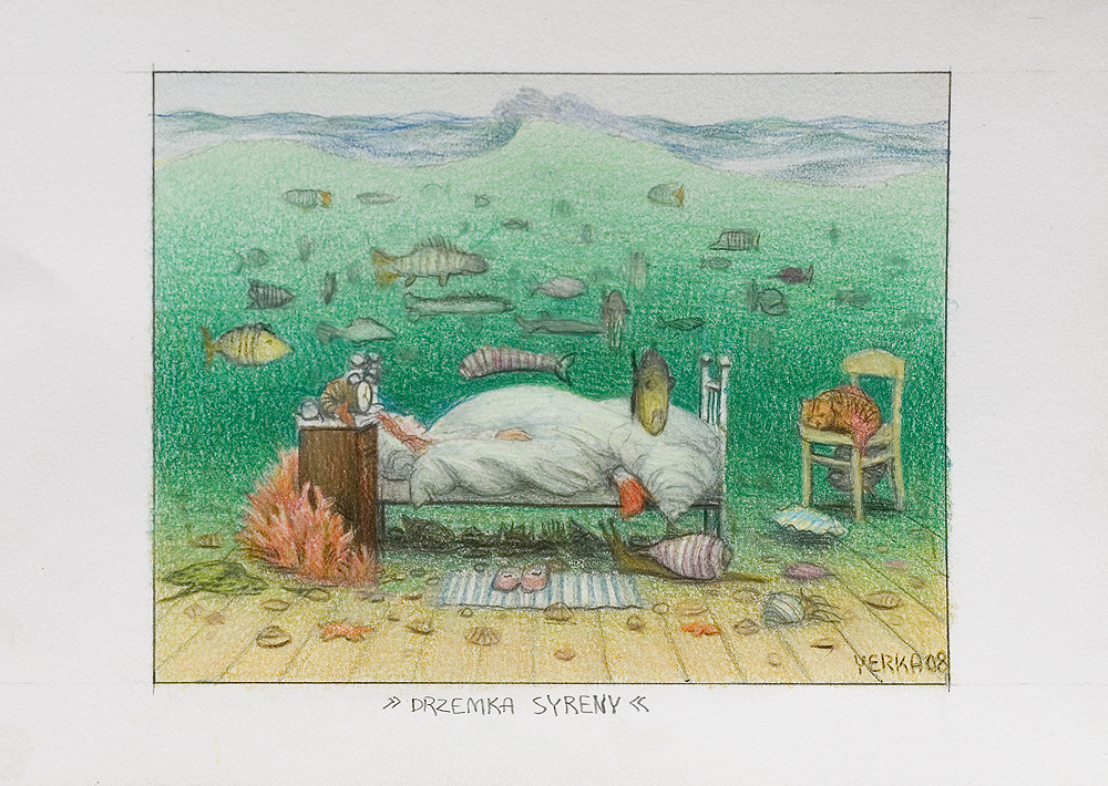 sygn. oł. p.d.: YERKA 08, pod kadrem rysunku śr.: >>DRZEMKA SYRENY<<