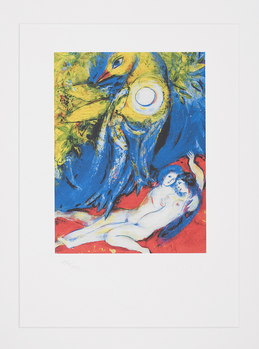 Marc Chagall uczył się rysunku u witebskiego malarza nazwiskiem Juda Pen, następnie od 1907 studiował w Akademii petersburskiej. W 1910 wyjechał na stypendium do Paryża. Zamieszkał w La Ruche na Montparnassie, wszedł do kręgu artystów, wśród których byli m.in. Modigliani, Soutine, Delaunay. W 1914 wrócił do Witebska, w 1915 poślubił Bellę (zm. 1944), muzę i bohaterkę wielu obrazów. W latach 1915-1917 mieszkał w Sankt Petersburgu, gdzie zastała go rewolucja. Mianowany komisarzem sztuk pięknych na obszar Witebska, założył tam i prowadził w latach 1918-1919 szkołę artystyczną, której profesorami byli m.in. Kazimierz Malewicz i El Lissitzky. W 1919 przeniósł się do Moskwy, gdzie do 1922 był kierownikiem artystycznym Państwowego Teatru Żydowskiego. W 1923 ostatecznie opuścił Rosję, osiedlając się w Paryżu. We Francji spędził resztę życia, z przerwą w latach 1941-1947, kiedy to schronił się w Nowym Jorku. Jego styl, wykształcony w młodości niezależnie od równoległych kierunków w sztuce, pozostał w ciągu życia artysty mało zmieniony. Wyobraźnia i sposób obrazowania Chagalla, zbliżone do sztuki naiwnej, wpisały się najsilniej w nurt surrealizmu, stając się jego znaczącym rozszerzeniem. Chagall łączył poetyckość i cudowność swych fantazji z rozwiniętym warsztatem malarza-kolorysty. Był też utalentowanym i płodnym grafikiem (cykle ilustracji do "Martwych dusz" Gogola, 1923-1927, "Bajek" La Fontaine’a, 1927-1930, Biblii, 1931-1955 – każdy cykl liczył ponad 100 plansz w technikach metalowych). Zajmował się scenografią (projekty dla Metropolitan Opera w Nowym Jorku, 1945, Opery w Paryżu, 1958), malarstwem monumentalnym (plafon w Operze paryskiej, 1963-1964), projektował witraże, dekoracje ceramiczne.