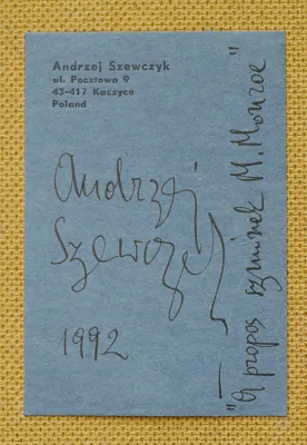 Andrzej Szewczyk (Szopienice k. Katowic 1950 - Cieszyn 2001) pod koniec lat 60. związany był z krakowskim środowiskiem artystycznym skupionym wokół Galerii Krzysztofory, zawarł przyjaźnie z Krzysztofem Niemczykiem i Tomaszem Wawakiem. W latach 1974-78 studiował Wychowanie Plastyczne na Uniwersytecie Śląskim. Od r.1977 stale współpracował z warszawską Galerią Foksal, gdzie wielokrotnie wystawiał. Na stałe zamieszkał we wsi Kaczyce Górne. Jego różnorodna twórczość inspirowana poezją i literaturą prowokowała widza do własnych skojarzeń. Wypowiadał się językiem wizualnym a także pisanym. Na początku lat 80. tworzył też instalacje ze ścinek kredek i ołówków, zaś jego późniejsze realizacje nabierają bogatszych treści. Był przedstawicielem sztuki konceptualnej. Wernisażu ostatniej, osobiście konsultowanej z organizatorami wystawy swoich prac w poznańskiej Galerii Muzalewska nie doczekał. Zmarł na krótko przed jej uroczystym otwarciem.