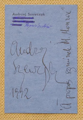 Andrzej Szewczyk (Szopienice k. Katowic 1950 - Cieszyn 2001) pod koniec lat 60. związany był z krakowskim środowiskiem artystycznym skupionym wokół Galerii Krzysztofory, zawarł przyjaźnie z Krzysztofem Niemczykiem i Tomaszem Wawakiem. W latach 1974-78 studiował Wychowanie Plastyczne na Uniwersytecie Śląskim. Od r.1977 stale współpracował z warszawską Galerią Foksal, gdzie wielokrotnie wystawiał. Na stałe zamieszkał we wsi Kaczyce Górne. Jego różnorodna twórczość inspirowana poezją i literaturą prowokowała widza do własnych skojarzeń. Wypowiadał się językiem wizualnym a także pisanym. Na początku lat 80. tworzył też instalacje ze ścinek kredek i ołówków, zaś jego późniejsze realizacje nabierają bogatszych treści. Był przedstawicielem sztuki konceptualnej. Wernisażu ostatniej, osobiście konsultowanej z organizatorami wystawy swoich prac w poznańskiej Galerii Muzalewska nie doczekał. Zmarł na krótko przed jej uroczystym otwarciem.