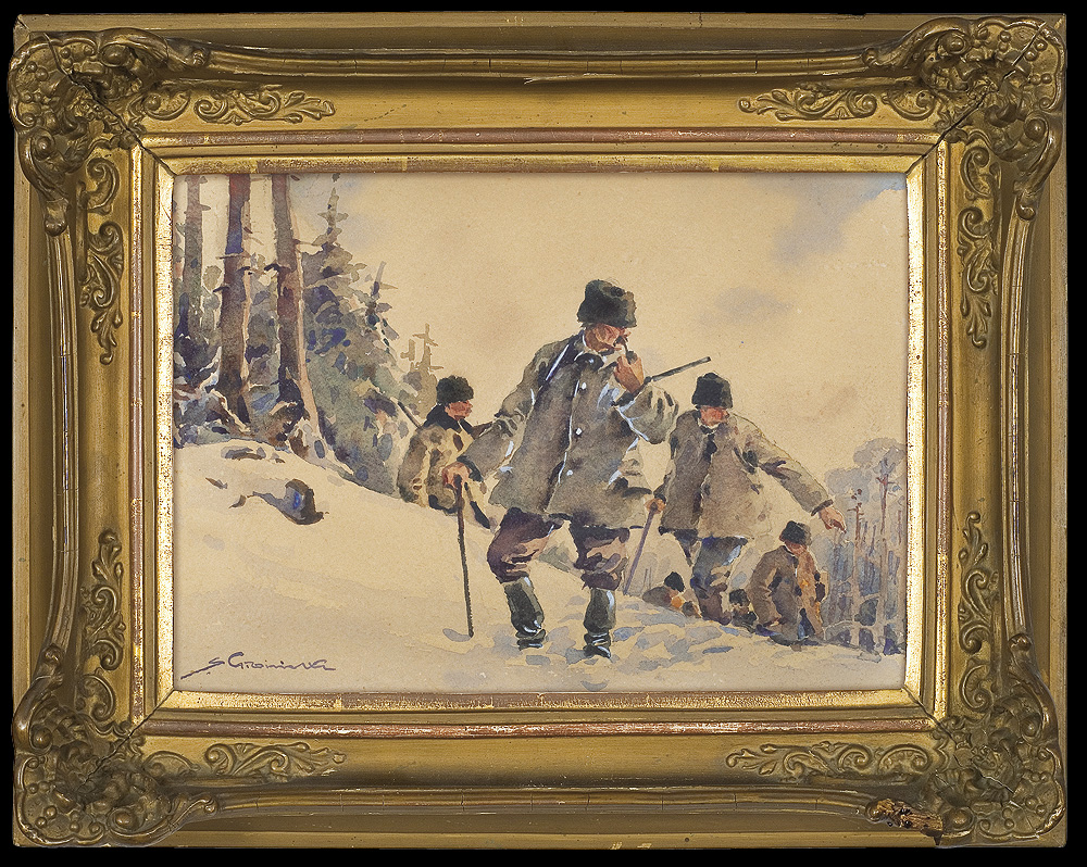 Stanisław Gibiński (Rzeszów 1882 – Katowice 1971) od wczesnej młodości pracował na kolei, początkowo w Rzeszowie, następnie w Krakowie, gdzie równocześnie mógł podjąć naukę w Akademii Sztuk Pięknych, prawdopodobnie jako wolny słuchacz. W czasie I wojny światowej służył w II Brygadzie Legionów dowodzonej przez J. Hallera i odbył kampanię w Karpatach, walcząc pod Rafajłową, Mołodecznem, Przełęczą Pantyrską. Po wojnie nadal pracował na kolei, łącząc pracę zawodową z twórczością plastyczną. Był malarzem akwarelistą; malował pejzaże, wiejskie sceny rodzajowe, rybaków czy polowania, które najczęściej przedstawiał w śnieżnym, zimowym pejzażu. Sam często uczestniczył w polowaniach i ten temat znał doskonale. Malował też moczary, rozlewiska, krajobrazy jesienne. W jego malarstwie wyraźnie widoczne są inspiracje sztuką Fałata, ale też Wyczółkowskiego i malarzy krakowskiej szkoły pejzażu. Artysta wielokrotnie uczestniczył w wystawach krakowskiego TPSP, a po 1926 także w wystawach „Niezależnych“. Wystawiał też i w innych miastach, a jego sztuka cieszyła się znacznym powodzeniem