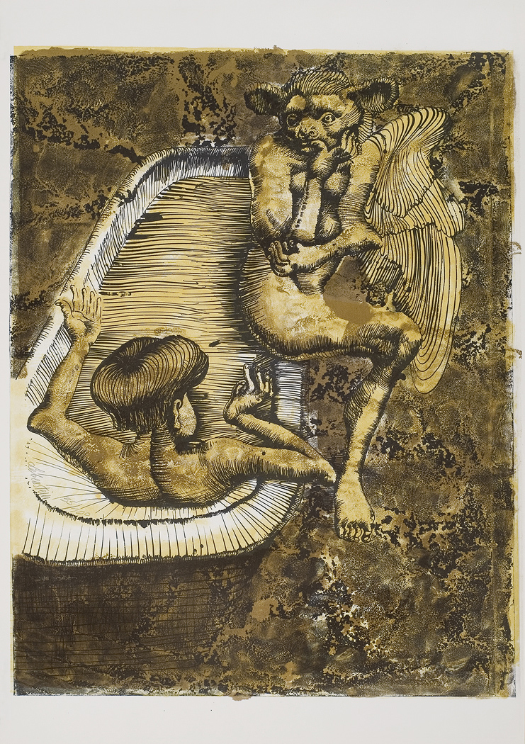 Jan Lebenstein (Brześć Litewski 1930 - Kraków 1999) w latach 1948-1954 studiował malarstwo w ASP w Warszawie pod kierunkiem prof. Eugeniusza Eibischa i Artura Nachta-Samborskiego. W 1955 wziął udział w wystawie w warszawskim Arsenale. Zaprzyjaźniony w czasie studiów z Mironem Białoszewskim, swą pierwszą wystawę indywidualną pokazał w 1956 w Teatrze na Tarczyńskiej. W 1959 zdobył Grand Prix de la Ville de Paris na I Biennale Młodych w Paryżu i w tym roku przeniósł się na stałe do Paryża. Po seriach "figur kreślonych" (na papierze milimetrowym) i "figur hieratycznych" z lat 1955-1958 maluje cykl "figur osiowych" (1958-1962), które wystawia w Paryżu i USA. Równolegle w 1960 zaczyna rysowane "karnety", rodzaj dziennika, który w przyszłości dostarczy motywów wykorzystanych w obrazach. W latach 1964-1965 maluje "Bestiarium", cykl fakturowych, archaizowanych stworów przypominających prehistoryczne wykopaliska. Bezpośrednio po nich wprowadza do swych obrazów postaci ludzkie i fantastyczne, odgrywające sceny ni to mitologiczne, ni to ze snu, często przesycone erotyką. W 1970 projektuje witraże dla Centre du Dialogue w Paryżu. W W 1971 otrzymuje obywatelstwo francuskie 1974 powstają gwasze inspirowane Folwarkiem zwierzęcym George'a Orwella. W latach 1976-1989 tworzy wyłącznie w technice gwaszu i pastelu, podejmując tematykę mitologiczną i zaczerpniętą z Biblii: cykle ilustracji do Księgi Hioba (wyd. 1979) i do Apokalipsy (wyd. 1986) w nowych przekładach Czesława Miłosza. W 1989 powraca do malarstwa olejnego (cykl "Pergamon"). Artysta otrzymał m. in. nagrodę Fundacji im. Alfreda Jurzykowskiego w 1976, Nagrodę Muzeum Archidiecezji Warszawskiej w 1985, Nagrodę im. Jana Cybisa w 1987.