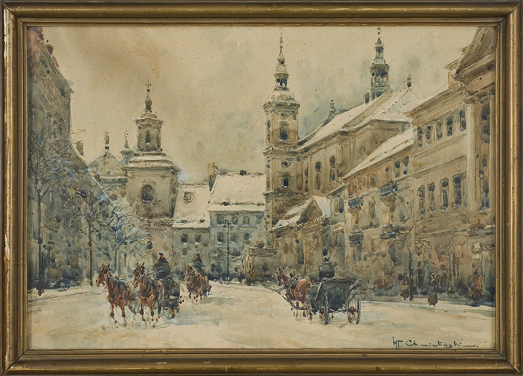 Władysław Chmieliński (Warszawa 1911 - Warszawa 1979) był malarzem związanym z Warszawą, gdzie stale mieszkał i pracował. W latach 1926-1931 studiował w warszawskiej Miejskiej Szkole Sztuk Zdobniczych i Malarstwa (dawna Klasa Rysunkowa). Wiodącym tematem jego obrazów były widoki miejskie, malowane olejno i akwarelą. W latach 1935-1938 stworzył cykl akwarel przedstawiających obiekty polskiej architektury; wśród nich, widoki Sandomierza, Krakowa, Kazimierza nad Wisłą, a także wnętrza zabytkowych kościołów czy pałaców, m.in. Zamku Królewskiego w Warszawie i Pałacu w Wilanowie. Malował także pejzaże i wiejskie sceny rodzajowe – kuligi, sanny, zaprzęgi, wesela, konie na tle krajobrazu. W latach 1967-1969 wyjeżdżał na dłuższe pobyty do Danii. W latach 1936-1939 artysta używał także pseudonimu „Władysław Stachowicz”.
