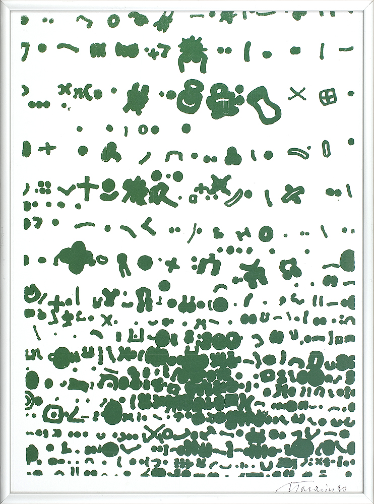 Jan Tarasin (Kalisz 11 IX 1926 - Warszawa 8 VIII 2009) studiował malarstwo w ASP w Krakowie pod kierunkiem prof. Zbigniewa Pronaszki (1946-1951). Jeszcze jako student zadebiutował na I Wystawie Sztuki Nowoczesnej w Krakowie w 1948/49. W połowie lat 50. stworzył cykle litografii: „Nowa Huta i jej mieszkańcy“, 1954, „Dom“, 1955). W pierwszym przeciwstawił się oficjalnemu optymizmowi, w drugim, operując symboliką martwej natury, zawarł treści egzystencjalne i odnoszące do niedawnego dramatu wojny. Po 1956 zaczął malować obrazy niefiguratywne. Układy wyodrębnionych elementów (określanych jako „przedmioty“) umieszczane były przez artystę na płaszczyźnie (cykl „Wnętrze“, 1957) ), lub w aluzyjnej przestrzeni (cykle „Uczta“, 1957, „Brzeg“, 1962-1964, „Przedmioty policzone“, od 1968, „Antykwariat“, 1968). Zasada ta utrzymuje się w jego malarstwie w następnych latach, różnice między okresami twórczości dotyczą sposobu opracowania „przedmiotów“ i ich usytuowania w przestrzeni obrazu lub wobec tła. Od lat 70. „przedmioty“ zmieniają się w graficzne, zwykle czarne znaki na jasnych tłach (cykl „Kolekcja“, od 1971). Tła z kolei bywają iluzyjnie przestrzenne, zróżnicowane walorowo, miękkie. W latach 90. artysta wrócił do kolorystycznego, bardziej malarskiego rozwiązywania zarówno znaków, jak i teł, często ciemnych lub przenikających się z „przedmiotami“ (cykl „Wylęgarnia przedmiotów“, 1992). Tarasin od 1962 jest członkiem „Grupy Krakowskiej“. W 1963-67 uczył na Wydziale Architektury Wnętrz krakowskiej ASP. W 1967 przeniósł się do Warszawy, w 1974 podjął pracę pedagogiczną na Wydziale Malarstwa ASP w Warszawie. W 1987-90 był rektorem tej uczelni. W 1976 otrzymał Nagrodę Krytyki Artystycznej im. Cypriana Kamila Norwida, w 1984 Nagrodę im. Jana Cybisa.; Nagroda na MB Sztuki w San Marino 1965. Równolegle z malarstwem zajmował się rysunkiem i grafiką - do lat 60. litografią, od 1974 serigrafią. W 1974-1981 wydał 8 autorskich „Zeszytów“ z serigrafiami i własnymi tekstami. W 1995 w Galerii Zachęta odbyła się wystawa artysty, której towarzyszył monograficzny katalog.